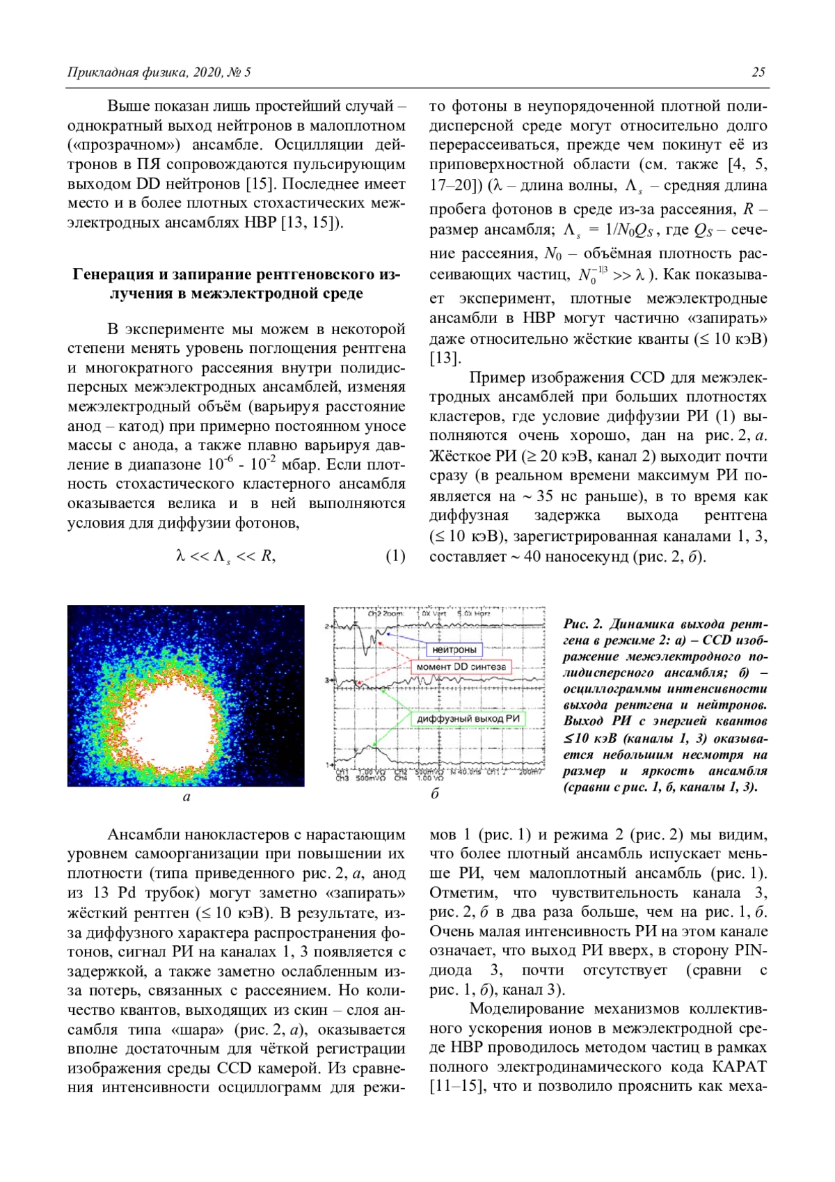 Выход РИ в разряде с Pd анодом в трёх спектральных интервалах, измеренный недавно с использованием метода фильтров Росса [33], приведен в работе [34]. Из гистограмм выхода рентгена [34] видно, что в спектрах присутствует как K–Pd, так и переходы с более высоких уровней для меньших энергий (типа L – Pd), а также заметная часть тормозного излучения с энергиями в интервале 30– 55 кэВ. Отметим, что выше описаны наблюдавшиеся вспышки РИ для палладиевого анода [13], но, в принципе, выбор материала анода в НВР позволит реализовать вспышку с флуоресцентной линией K любого элемента, из которого сделан анод, в соответствующей ему плотной эрозионной межэлектродной полидисперсной среде.