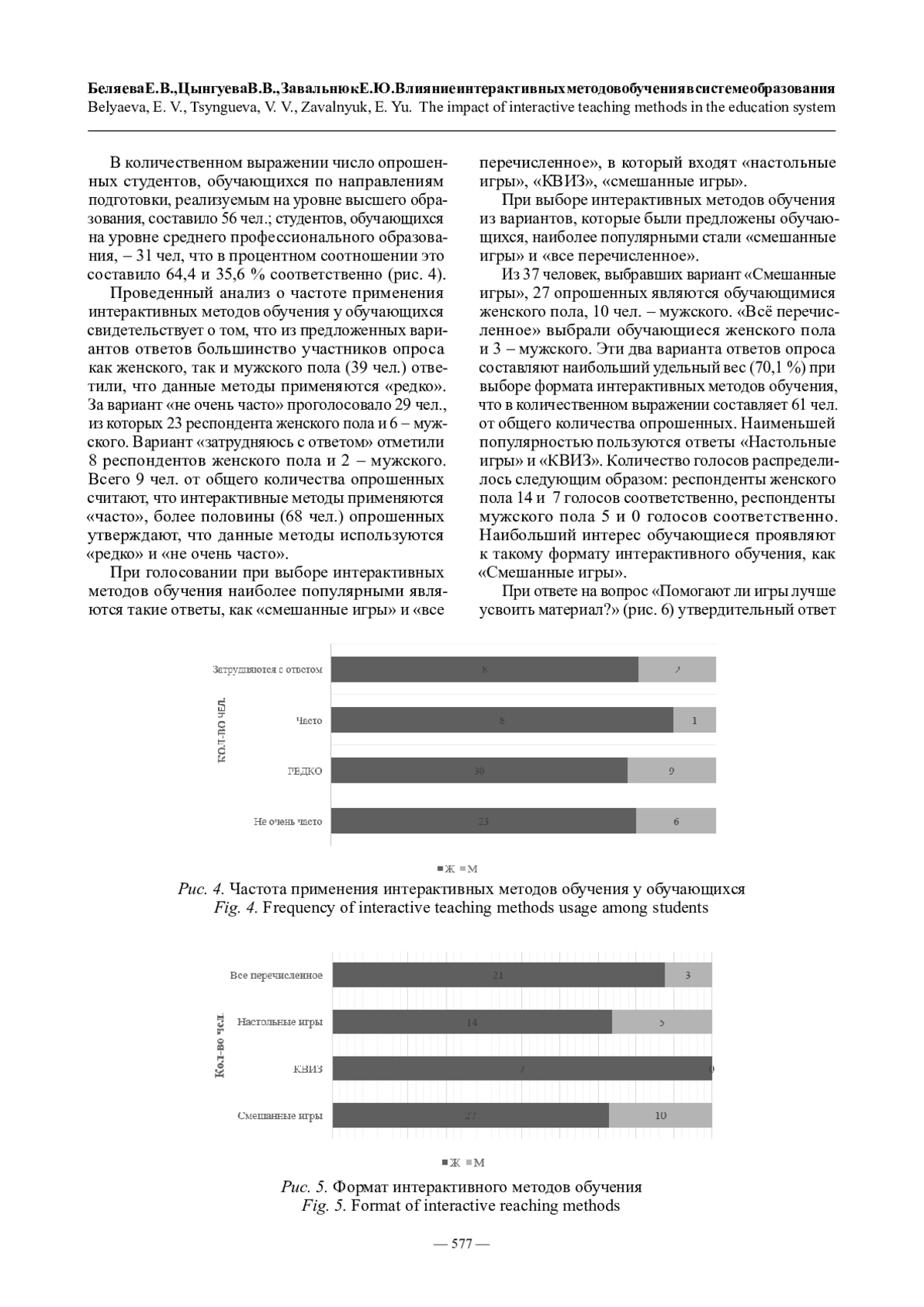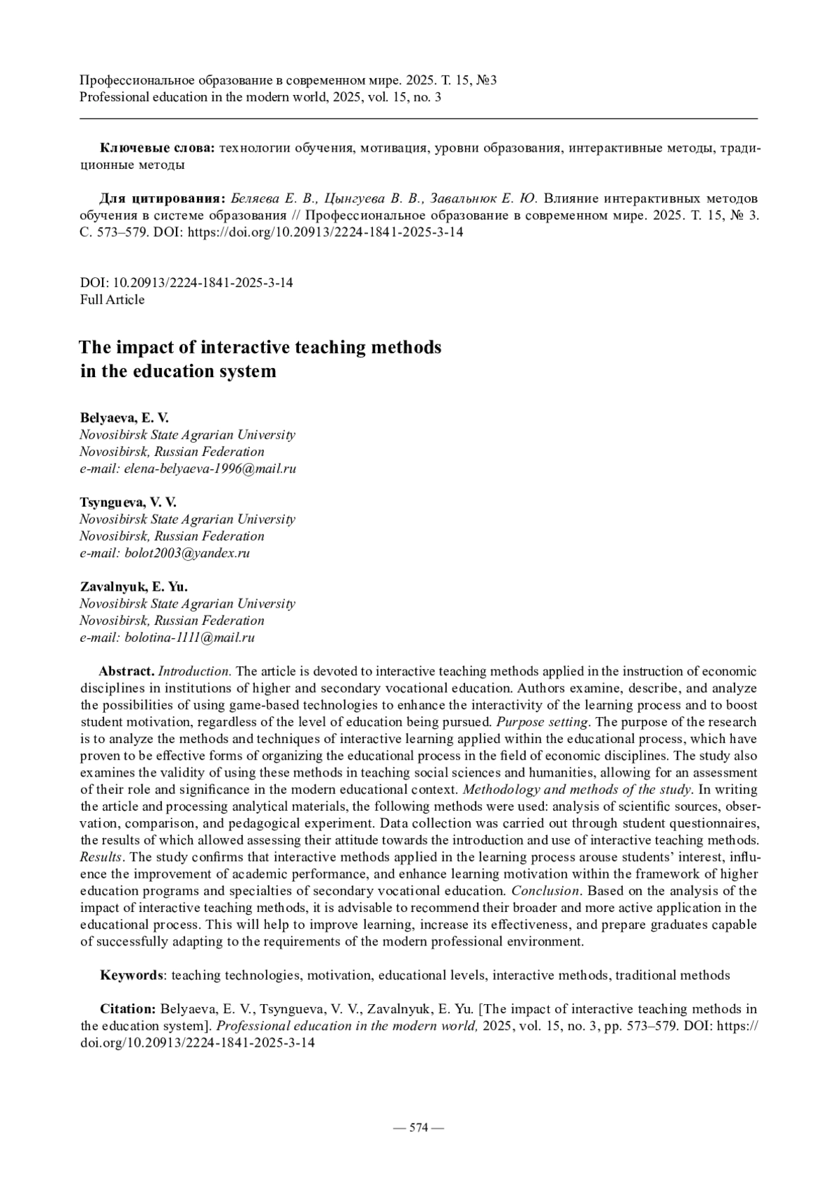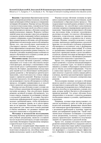 Результаты. В рамках исследования подтверждено, что интерактивные методы, применяемые в процессе обучения вызывают интерес у обучающихся, влияют на повышение академических результатов и учебную мотивацию в рамках подготовки по направлениям высшего образования и специальностям среднего профессионального образования.