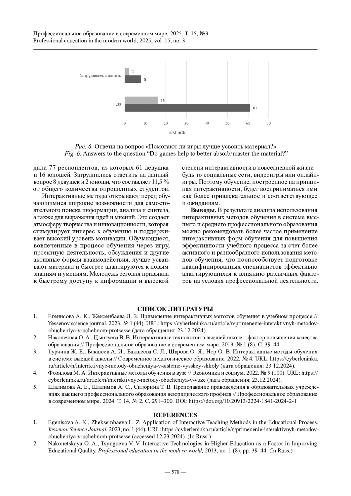 Выводы. На основе анализа влияния интерактивных методов обучения целесообразно рекомендовать более широкое и активное их применение в образовательном процессе. Это поможет улучшить обучение, повысить его эффективность и подготовить выпускников, способных успешно адаптироваться к требованиям современной профессиональной среды.