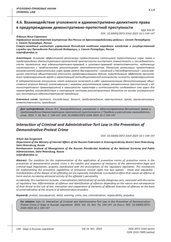 Условием эффективной реализации превентивного потенциала охранительных норм права в предупреждении демонстративно-протестной преступности выступает совместность и последовательность применения мер административно-правовой и уголовно-правовой ответственности, надлежаще согласованных с предписаниями регулятивного законодательства. Механизм реализации превентивных возможностей охранительных норм права имеет два варианта - линейный и последовательный - различающиеся степенью общественной опасности правонарушающего деяния, кумулятивным эффектом причиняемого правонарушением вреда и нарастающей антиобщественной активности личности правонарушителя. В содержательном отношении этот механизм включает в себя: криминализацию (деликтолизацию) общественно опасных деяний, согласованную с нормами регулятивного права; разграничение преступлений и административных правонарушений в зависимости характера и интенсивности создаваемых ими угроз для правопорядка; взаимодействие и кооперацию составов разноотраслевых деликтов на основе универсализации конструкции административной преюдиции.