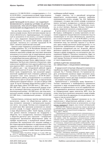В УК РК 2014 г. предусмотрены высокие размеры штрафа, которые непосильны большинству осужденных. Согласно Закону Республики Казахстан от 2 декабря 2021 года № 77-VII ЗРК «О республиканском бюджете на 2022 – 2024 годы» месячный расчетный показатель (далее – МРП) для исчисления пособий и иных социальных выплат, а также применения штрафных санкций, налогов и других платежей в соответствии с законодательством Республики Казахстан устанавливается в размере 3 063 тенге (примерно 399 российских рублей или 6,5 долларов США)3. Так, в ст. 41 «Штраф» УК РК 2014 г. за преступления устанавливается штраф в пределах от 200 (612 600 тенге, примерно 79 870 российских рублей или 1 301 доллар США) до 10 000 МРП (30 630 000 тенге, примерно, 3 993 480 российских рублей или 65 087 долларов США) либо в кратном размере.