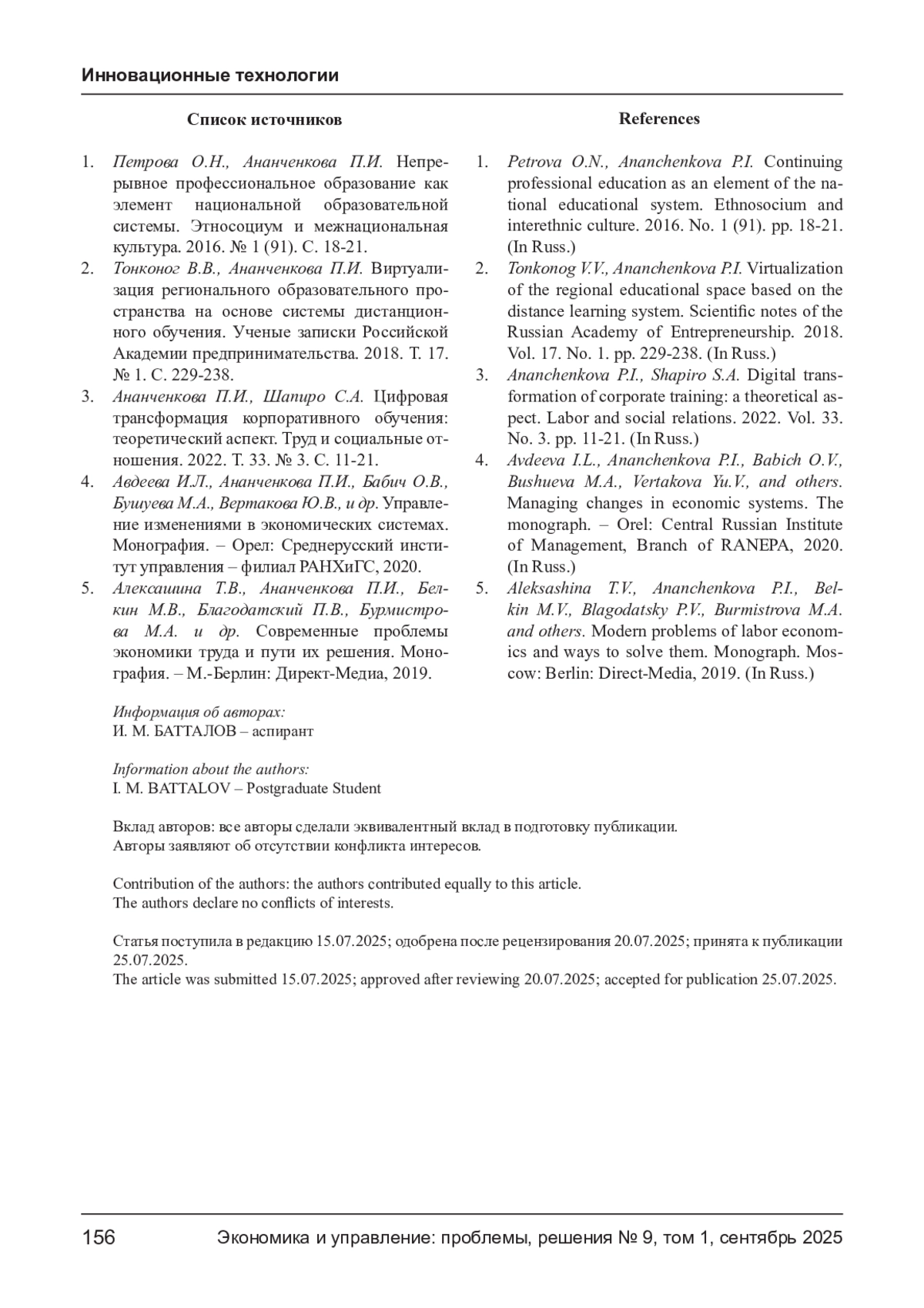 1. Петрова О.Н., Ананченкова П.И. Непрерывное профессиональное образование как элемент национальной образовательной системы. Этносоциум и межнациональная культура. 2016. № 1 (91). С. 18-21. EDN: VOXSBR