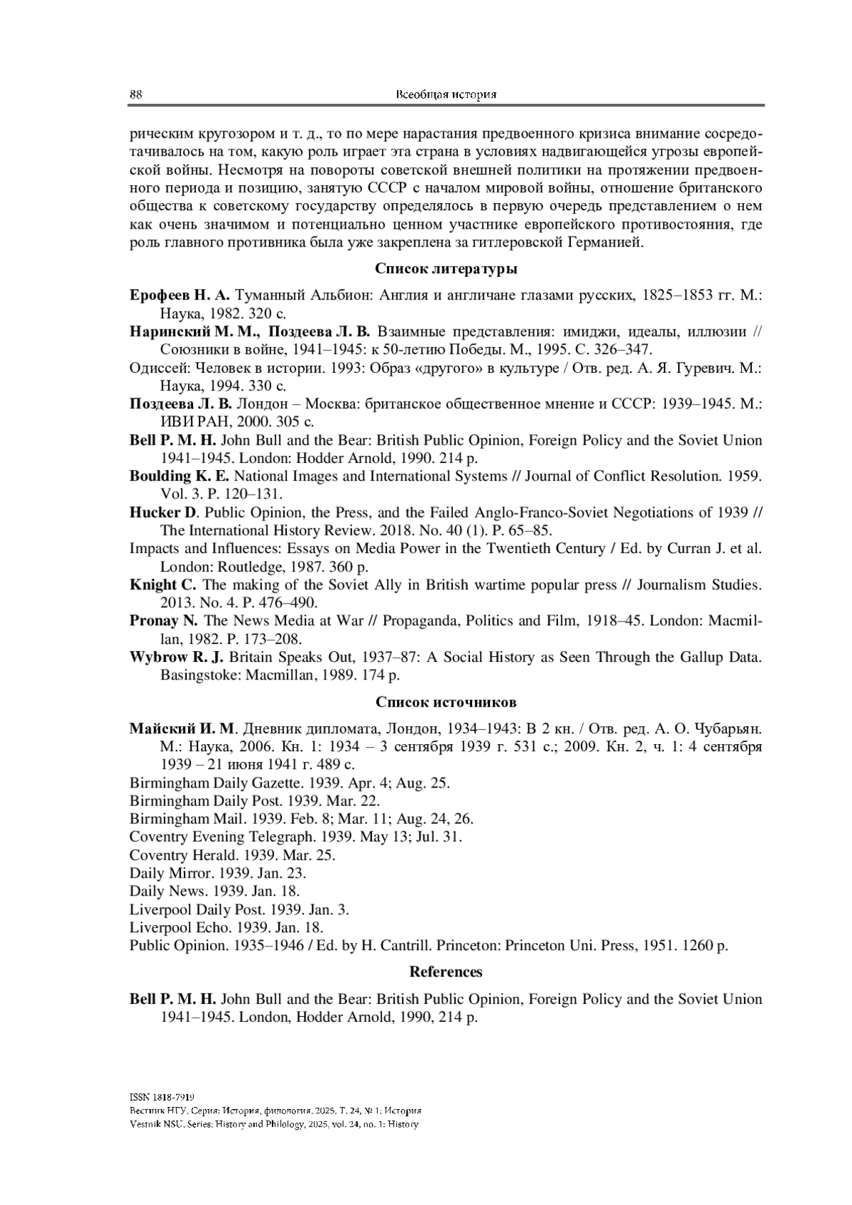 5. Bell P. M. H. John Bull and the Bear: British Public Opinion, Foreign Policy and the Soviet Union 1941-1945. London: Hodder Arnold, 1990. 214 p.