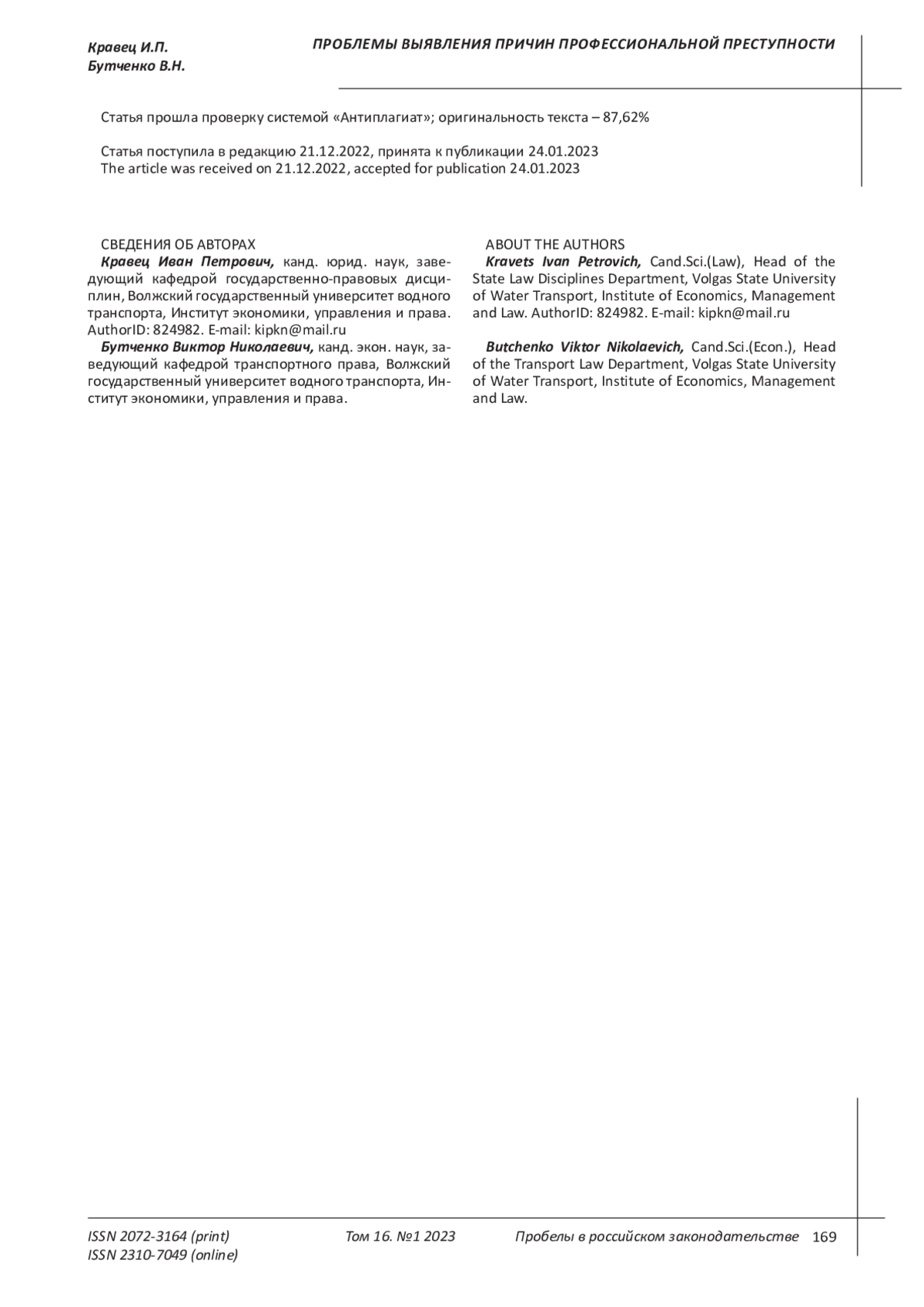 Kravets I.P., (2022), Problems of special measures to prevent professional crime. Gaps in Russian legislation, 2: 134-143. EDN: PZUKUF