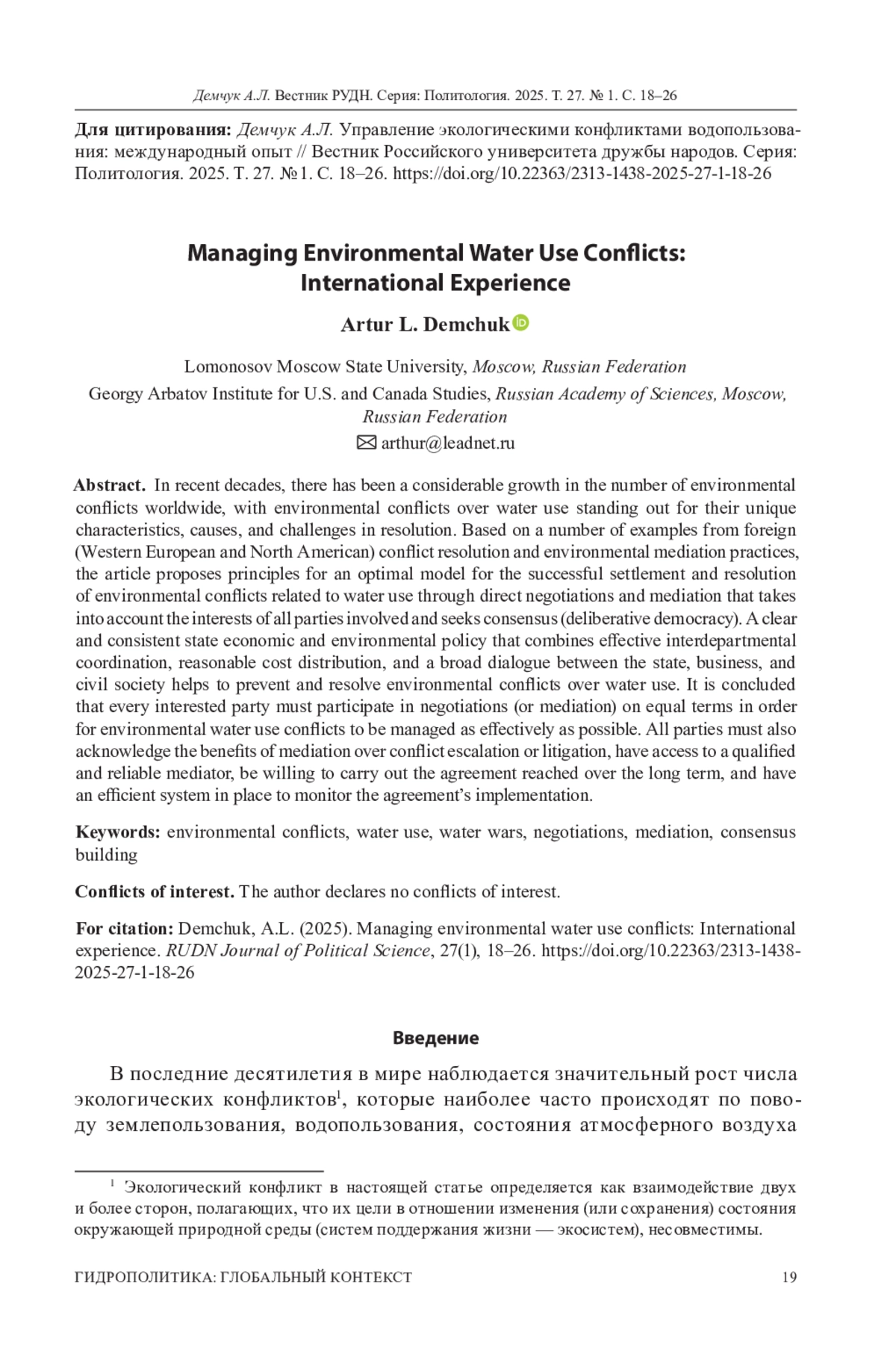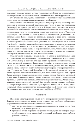 В последние десятилетия в мире наблюдается значительный рост числа экологических конфликтов, среди которых выделяются экологические конфликты водопользования, имеющие свои специфические характеристики, причины и трудности урегулирования. На основе ряда примеров из зарубежной (западноевропейской и североамериканской) практики конфликторазрешения и экологической медиации предлагаются принципы оптимальной модели успешного урегулирования и разрешения связанных с водопользованием экологических конфликтов посредством прямых переговоров и посредничества (медиации) на основе учета интересов всех сторон конфликта и поиска консенсуса (делиберативной демократии). Предотвращению и успешному урегулированию экологических конфликтов водопользования способствует ясная и последовательная государственная экономическая и экологическая политика, сочетающая эффективную межведомственную координацию, обоснованное распределение издержек, широкий диалог государства, бизнеса и гражданского общества. Наиболее эффективное управление подобными конфликтами обеспечивается при участии всех заинтересованных сторон конфликта в переговорах (или медиации) на условиях равенства; признании всеми сторонами конфликта преимуществ переговоров (медиации) по сравнению с дальнейшей эскалацией конфликта или судебным разбирательством; наличии квалифицированного и заслуживающего доверие всех участников конфликта медиатора (посредника); готовности участников переговоров в полной мере выполнять в долгосрочной перспективе принятые на себя по итогам переговоров и закрепленные в достигнутом соглашении обязательства; наличии действенной системы контроля выполнения сторонами взятых на себя обязательств.