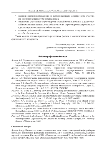 1. Демчук А.Л. Управление современными экологическими конфликтами в США и Канаде // США & Канада: экономика - политика - культура. 2020a. Вып. 5. C. 100-112. ;. DOI: 10.31857/S268667300009433-6 EDN: CRVVKN
