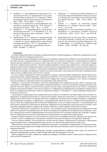9. Садовникова, М. Н. К вопросу о ресоциализации несовершеннолетних правонарушителей: работа с семьей как основа профилактики преступности несовершеннолетних / М. Н. Садовникова, А. С. Анищенко // Сибирский юридический вестник. - 2018. - № 4(83). - С. 104-112. EDN: YSXRET