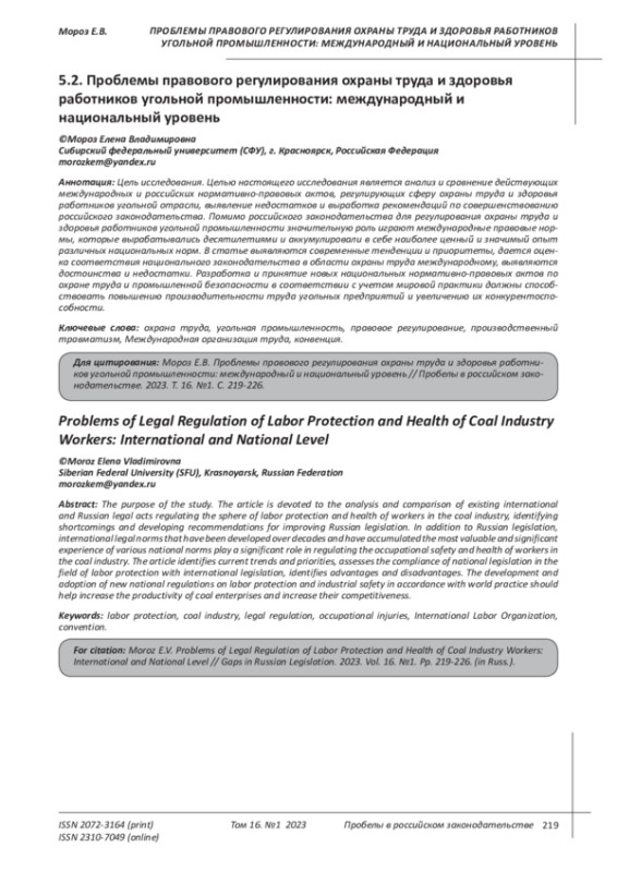 Цель исследования. Целью настоящего исследования является анализ и сравнение действующих международных и российских нормативно-правовых актов, регулирующих сферу охраны труда и здоровья работников угольной отрасли, выявление недостатков и выработка рекомендаций по совершенствованию российского законодательства. Помимо российского законодательства для регулирования охраны труда и здоровья работников угольной промышленности значительную роль играют международные правовые нормы, которые вырабатывались десятилетиями и аккумулировали в себе наиболее ценный и значимый опыт различных национальных норм. В статье выявляются современные тенденции и приоритеты, дается оценка соответствия национального законодательства в области охраны труда международному, выявляются достоинства и недостатки. Разработка и принятие новых национальных нормативно-правовых актов по охране труда и промышленной безопасности в соответствии с учетом мировой практики должны способствовать повышению производительности труда угольных предприятий и увеличению их конкурентоспособности.