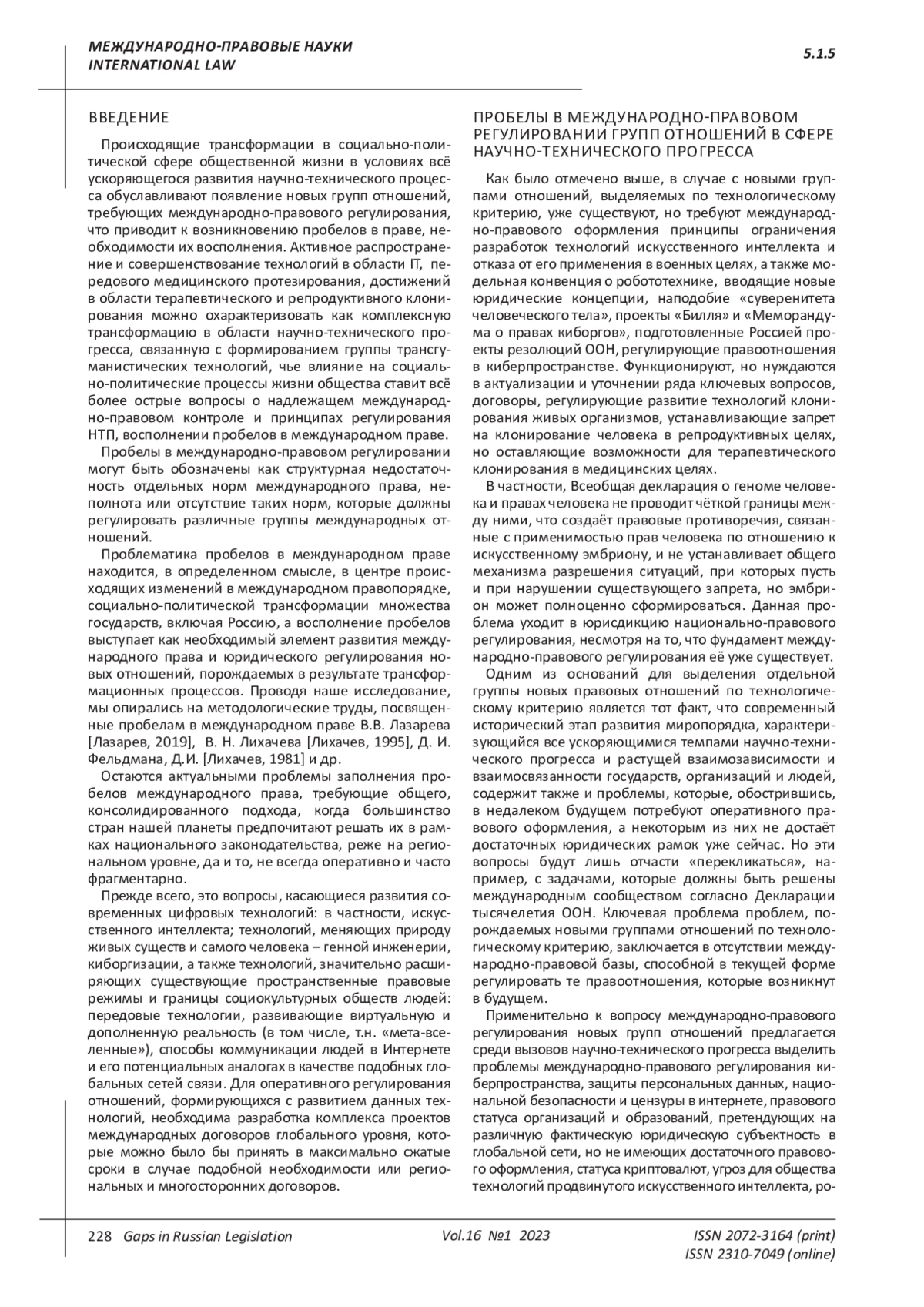 Цель и задачи написания статьи - исследование пробелов в международно-правовом регулировании групп отношений в сфере научно-технического прогресса в условиях социально-политической трансформации. Методологический подход. В работе используются общенаучные методы, в частности анализа и сравнения, а также методы юридического толкования. Результаты и выводы. В статье рассматривается актуальность и степень научной разработанности проблемы пробелов и их восполнения в международном праве в сфере научно-технического прогресса. Оригинальность и ценность работы заключается в определении природы пробела в международном праве в сфере научно-технического прогресса, выявлении возможностей его фиксации и способов восполнения в современном международном праве.