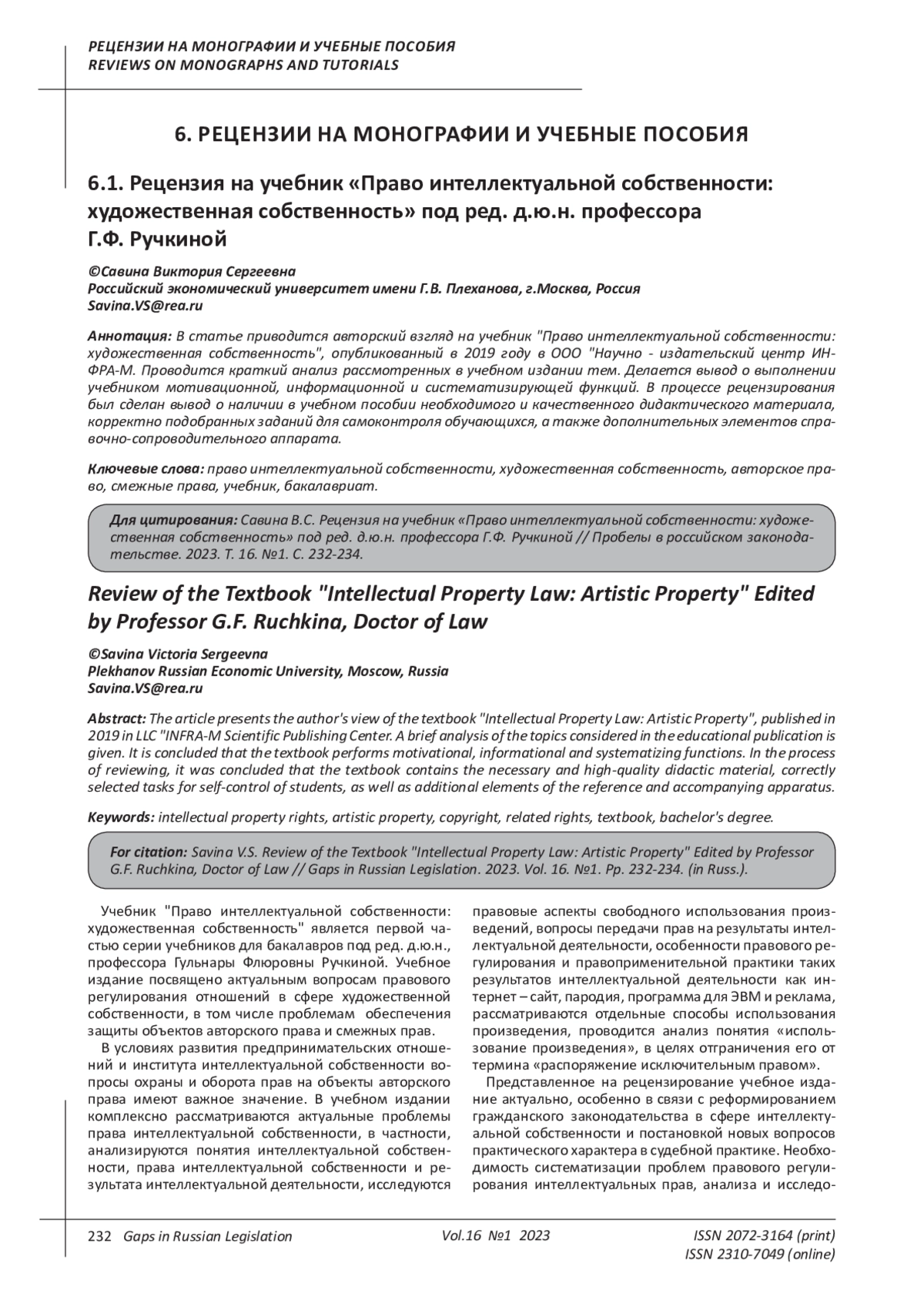 В статье приводится авторский взгляд на учебник “Право интеллектуальной собственности: художественная собственность”, опубликованный в 2019 году в ООО “Научно - издательский центр ИНФРА-М. Проводится краткий анализ рассмотренных в учебном издании тем. Делается вывод о выполнении учебником мотивационной, информационной и систематизирующей функций. В процессе рецензирования был сделан вывод о наличии в учебном пособии необходимого и качественного дидактического материала, корректно подобранных заданий для самоконтроля обучающихся, а также дополнительных элементов справочно-сопроводительного аппарата.