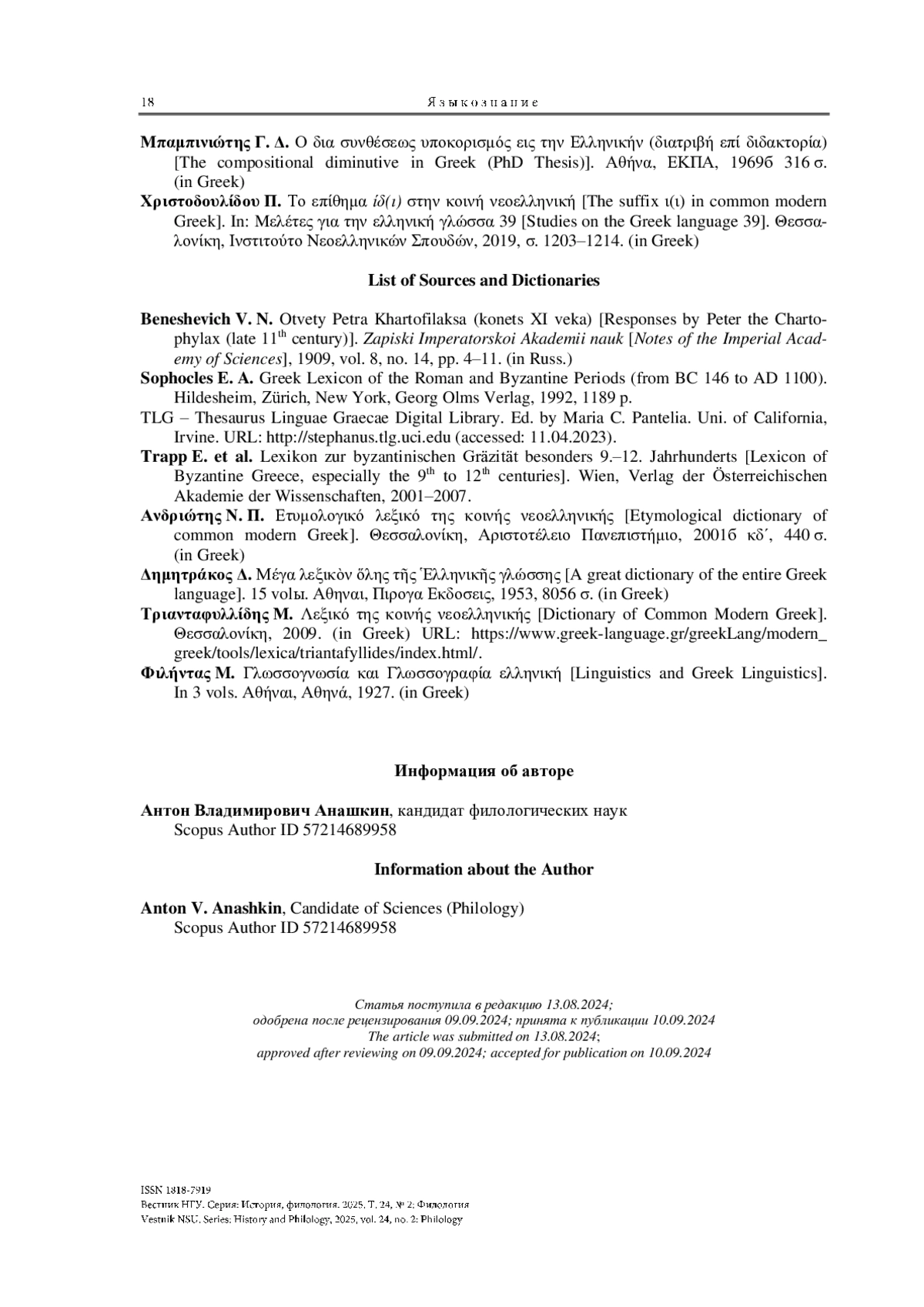 21. Χριστοδουλίδου Π. Το επίθημα ίδ(ı) στην κοινή νεοελληνική // Studies in Greek Linguistics 39. Θεσσαλονίκη: Ινστιτούτο Nεοελληνικών Σπουδών, 2019. P. 1203-1214.