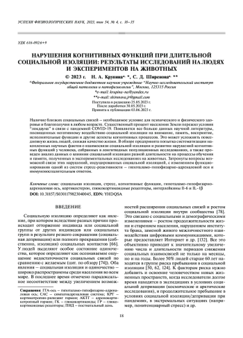 Статья: НАРУШЕНИЯ КОГНИТИВНЫХ ФУНКЦИЙ ПРИ ДЛИТЕЛЬНОЙ СОЦИАЛЬНОЙ ИЗОЛЯЦИИ: РЕЗУЛЬТАТЫ ИССЛЕДОВАНИЙ НА ЛЮДЯХ И ЭКСПЕРИМЕНТОВ НА ЖИВОТНЫХ (2023)