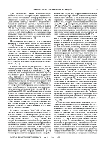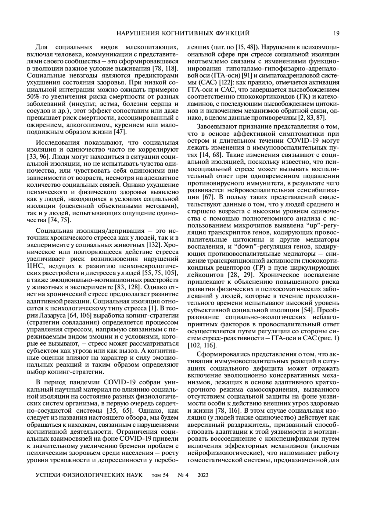 Наличие близких социальных связей – необходимое условие для психического и физического здоровья и благополучия в любом возрасте. Существенный процент населения Земли пережил условия “локдауна” в связи с пандемией COVID-19. Появляется все больше данных научной литературы, посвященных негативному воздействию социальной изоляции на внимание, память, восприятие, исполнительные функции и другие аспекты когнитивных процессов. Это может усложнять повседневную жизнь людей, снижая качество жизни. В обзоре предпринята попытка систематизации накопленных научных фактов о взаимосвязи социальной изоляции и развития нарушений когнитивных функций у человека, собранных в лонгитюдных популяционных исследованиях, а также проведен анализ данных о влиянии социальной изоляции разной длительности на процессы обучения и памяти, полученных в экспериментальных исследованиях на животных. Затронуты вопросы возможной связи этих нарушений, индуцированных социальной изоляцией, с изменением функционирования одной из систем стресс-реактивности – гипоталамо-гипофизарно-адреналовой оси и иммуновоспалительным ответом.