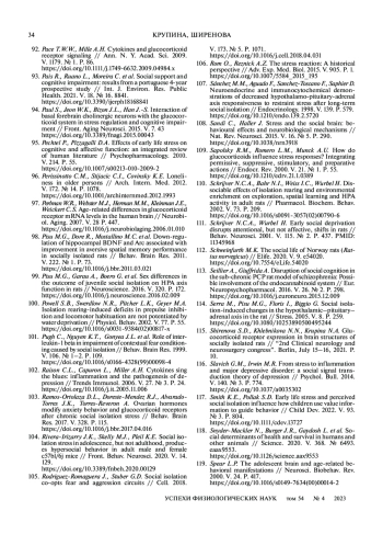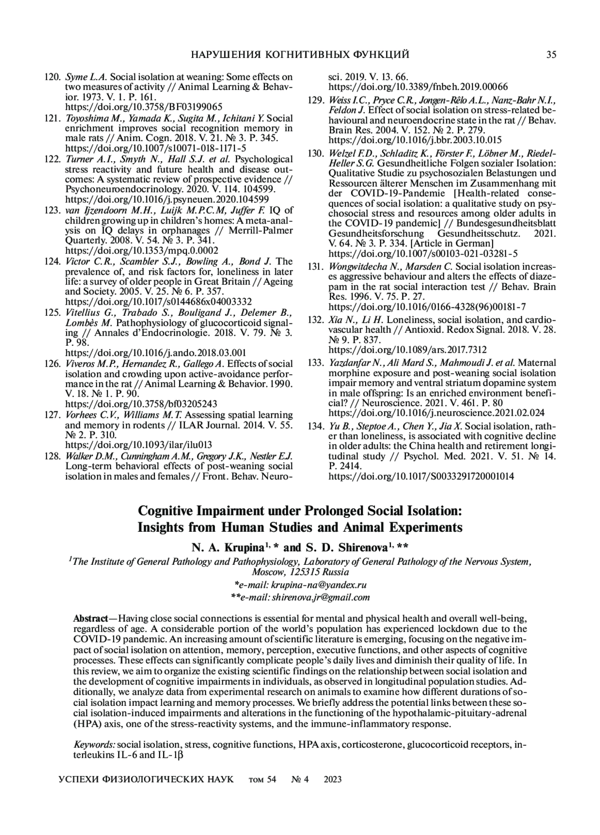 КРУПИНА Н. А., ШИРЕНОВА С. Д. НАРУШЕНИЯ КОГНИТИВНЫХ ФУНКЦИЙ ПРИ ДЛИТЕЛЬНОЙ СОЦИАЛЬНОЙ ИЗОЛЯЦИИ: РЕЗУЛЬТАТЫ ИССЛЕДОВАНИЙ НА ЛЮДЯХ И ЭКСПЕРИМЕНТОВ НА ЖИВОТНЫХ // УСПЕХИ ФИЗИОЛОГИЧЕСКИХ НАУК. 2023. Т. 54 № 4 (6 СТ.)