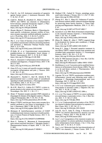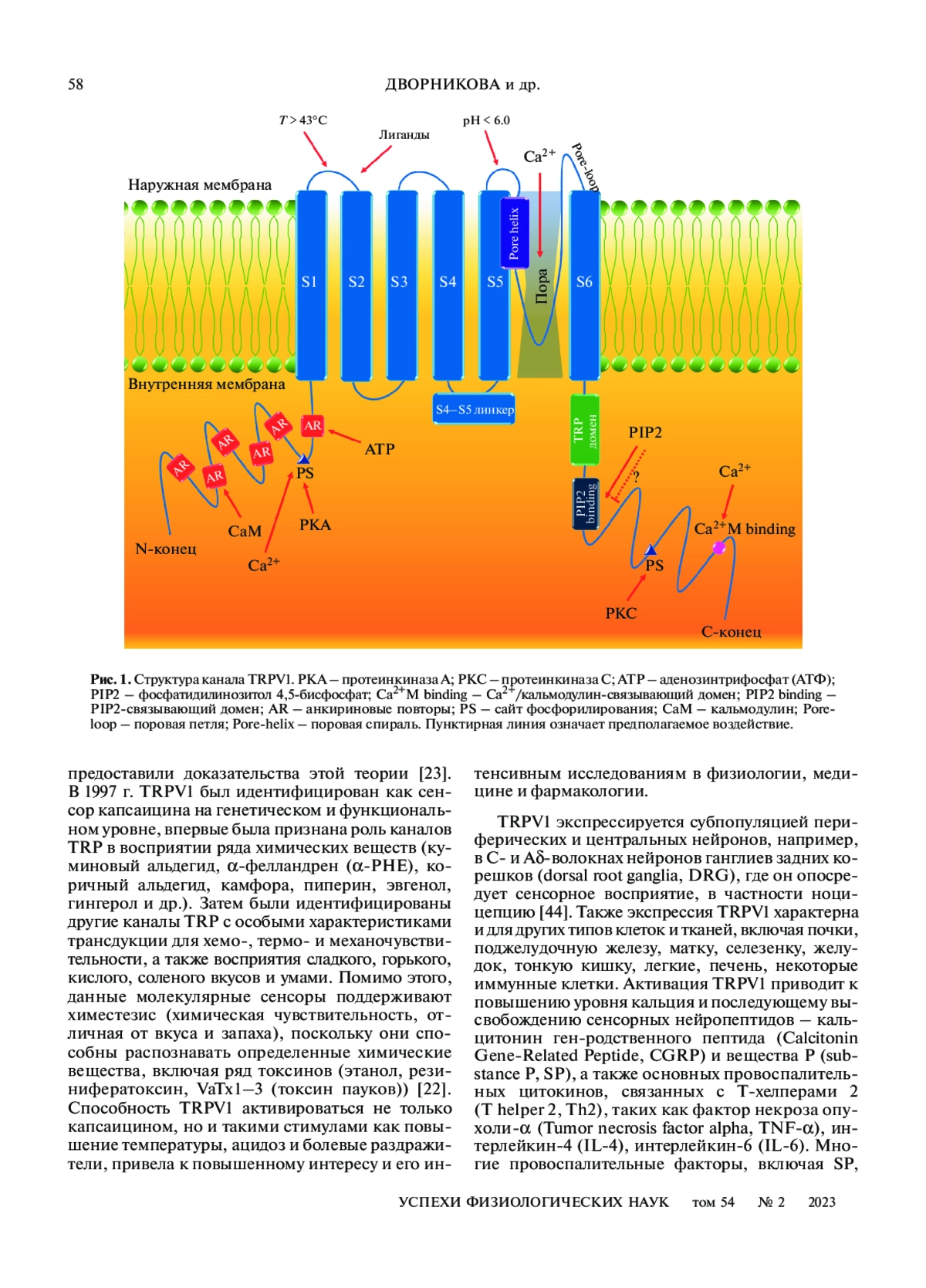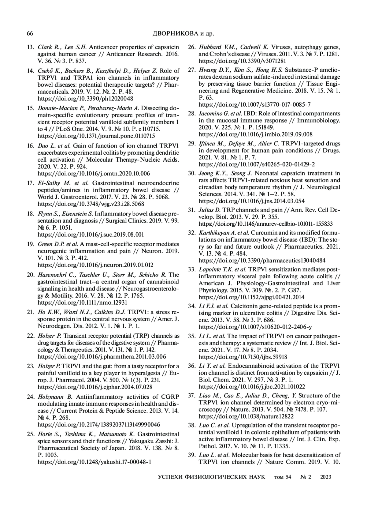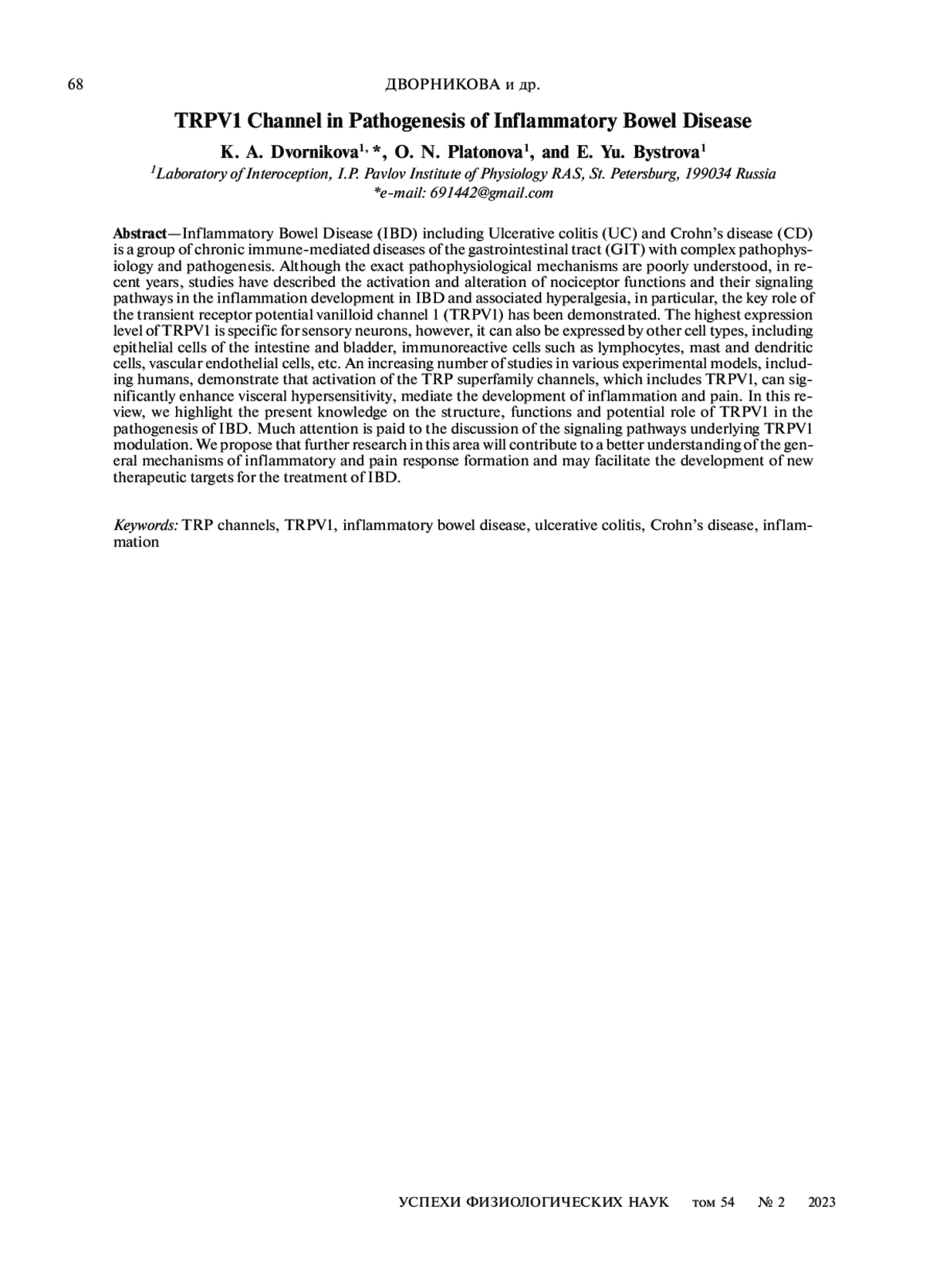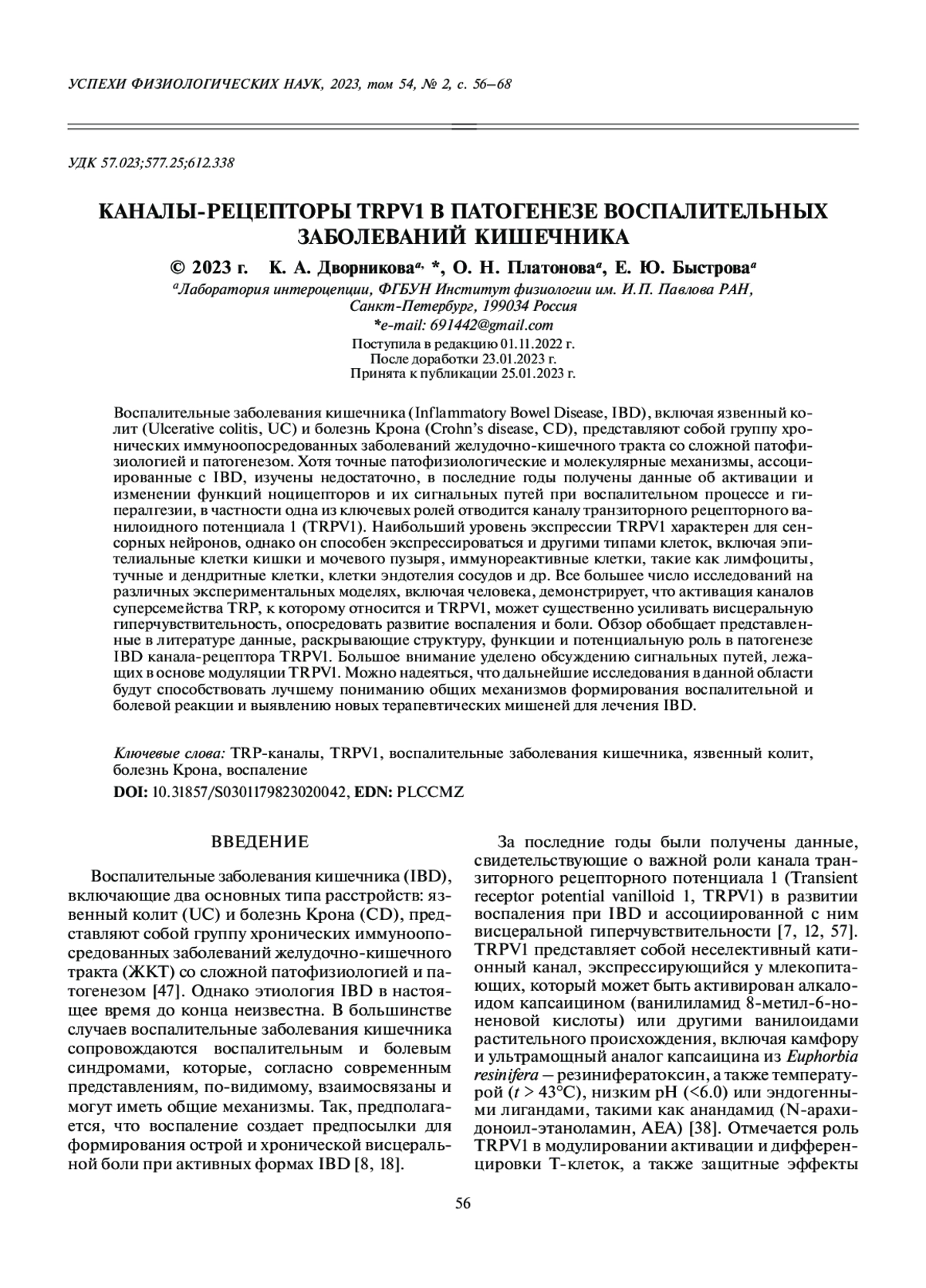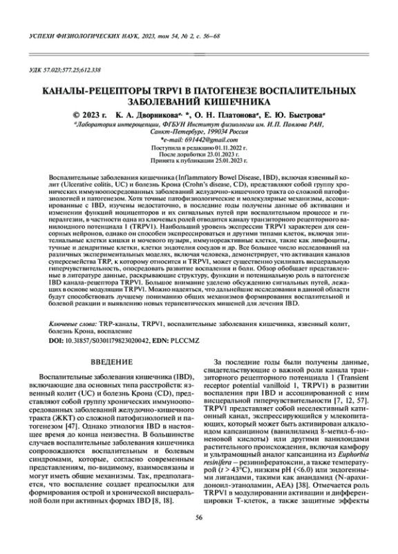 ДВОРНИКОВА К. А., ПЛАТОНОВА О. Н., БЫСТРОВА Е. Ю. КАНАЛЫ-РЕЦЕПТОРЫ TRPV1 В ПАТОГЕНЕЗЕ ВОСПАЛИТЕЛЬНЫХ ЗАБОЛЕВАНИЙ КИШЕЧНИКА // УСПЕХИ ФИЗИОЛОГИЧЕСКИХ НАУК. 2023. Т. 54 № 2 (6 СТ.)