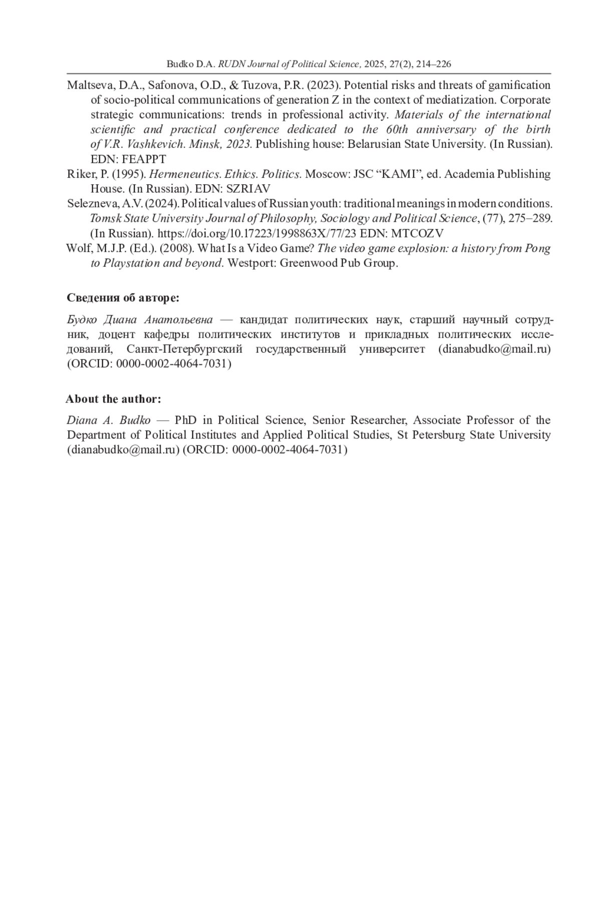 10. Мальцева Д.А., Сафонова О.Д., Тузова П.Р. Потенциальные риски и угрозы геймификации социально-политических коммуникаций молодежи поколения Z в условиях медиатизации // Корпоративные стратегические коммуникации: тренды в профессиональной деятельности: материалы международной научно-практической конференции, посвященной 60-летию со дня рождения В.Р. Вашкевича. Минск: Белорусский государственный университет, 2023. С. 141-145. EDN: FEAPPT