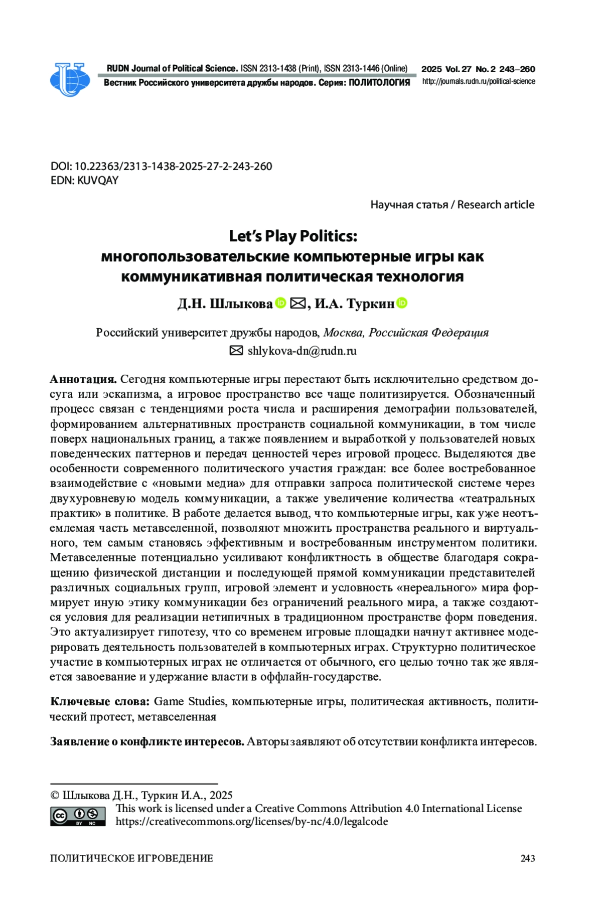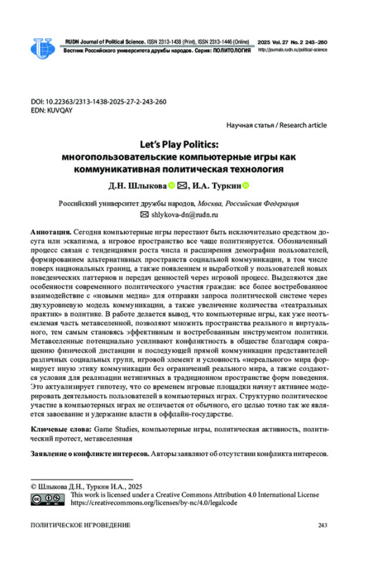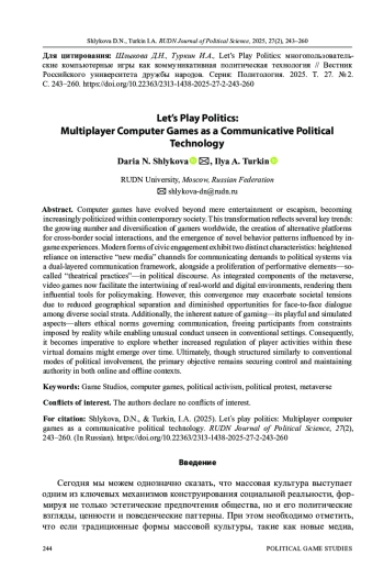 Сегодня компьютерные игры перестают быть исключительно средством досуга или эскапизма, а игровое пространство все чаще политизируется. Обозначенный процесс связан с тенденциями роста числа и расширения демографии пользователей, формированием альтернативных пространств социальной коммуникации, в том числе поверх национальных границ, а также появлением и выработкой у пользователей новых поведенческих паттернов и передач ценностей через игровой процесс. Выделяются две особенности современного политического участия граждан: все более востребованное взаимодействие с «новыми медиа» для отправки запроса политической системе через двухуровневую модель коммуникации, а также увеличение количества «театральных практик» в политике. В работе делается вывод, что компьютерные игры, как уже неотъемлемая часть метавселенной, позволяют множить пространства реального и виртуального, тем самым становясь эффективным и востребованным инструментом политики. Метавселенные потенциально усиливают конфликтность в обществе благодаря сокращению физической дистанции и последующей прямой коммуникации представителей различных социальных групп, игровой элемент и условность «нереального» мира формирует иную этику коммуникации без ограничений реального мира, а также создаются условия для реализации нетипичных в традиционном пространстве форм поведения. Это актуализирует гипотезу, что со временем игровые площадки начнут активнее модерировать деятельность пользователей в компьютерных играх. Структурно политическое участие в компьютерных играх не отличается от обычного, его целью точно так же является завоевание и удержание власти в оффлайн-государстве.
