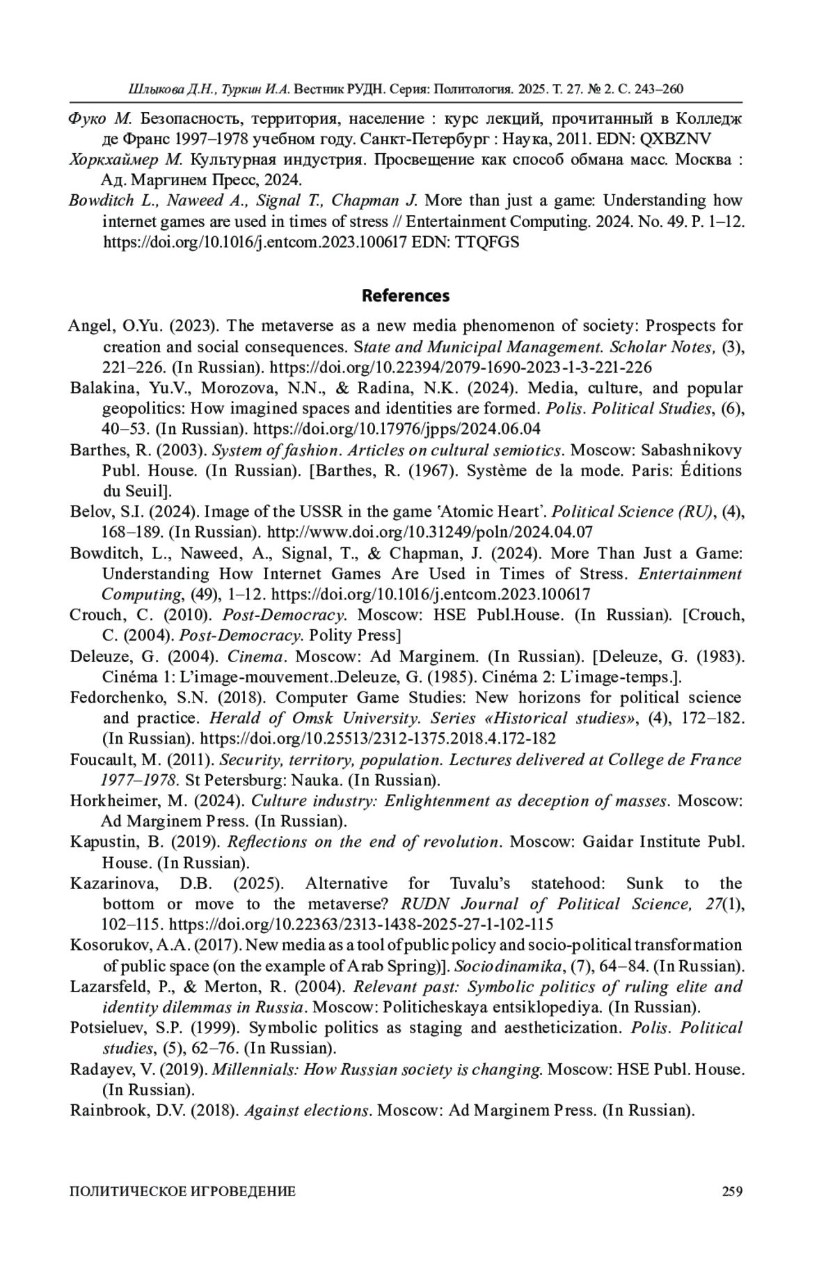 5. Белов С.И. Образ СССР в игре Atomic Heart (“Атомное сердце”) // Политическая наука. 2024. № 4. С. 168-189. http://www. DOI: 10.31249/poln/2024.04.07 EDN: BFLMDN