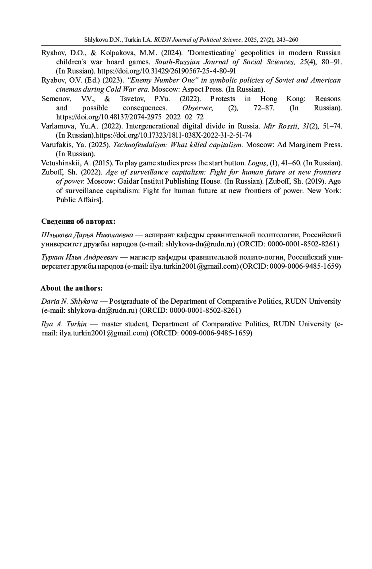20. Рябов Д.О., Колпакова М.М. “Одомашнивание” геополитики современных российских детских настольных военных играх // Южно-российский журнал социальных наук. 2024. Т. 25. № 4. С. 80-91. DOI: 10.31429/26190567-25-4-80-91 EDN: VRCCLI