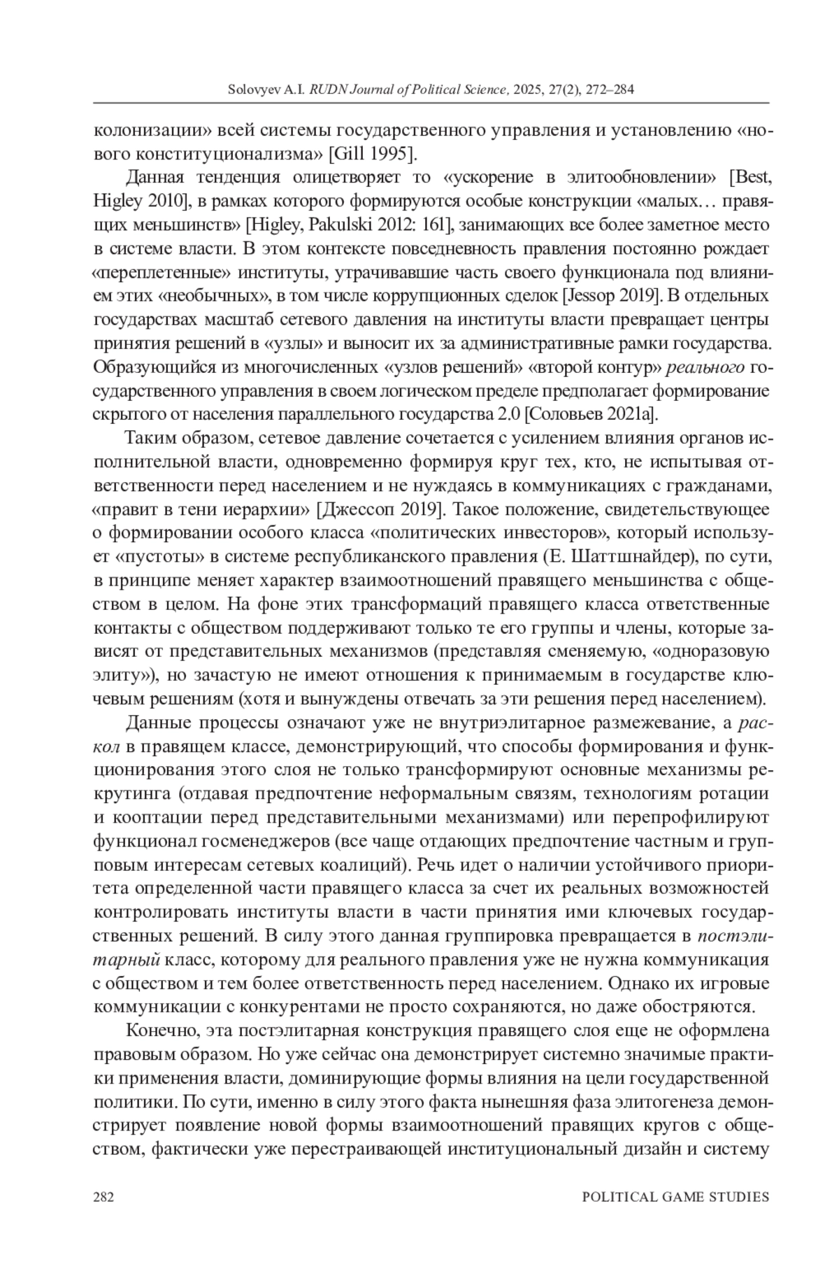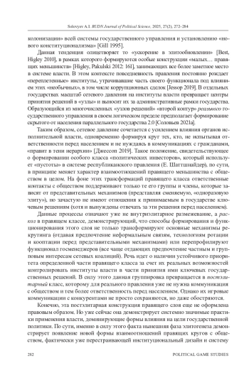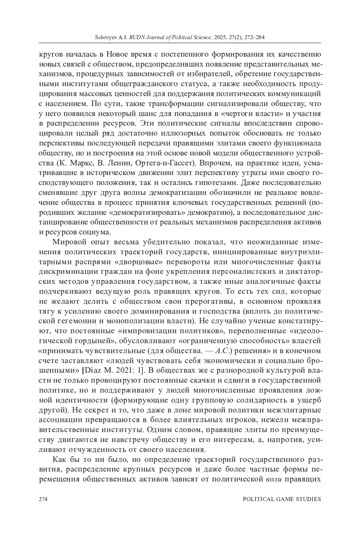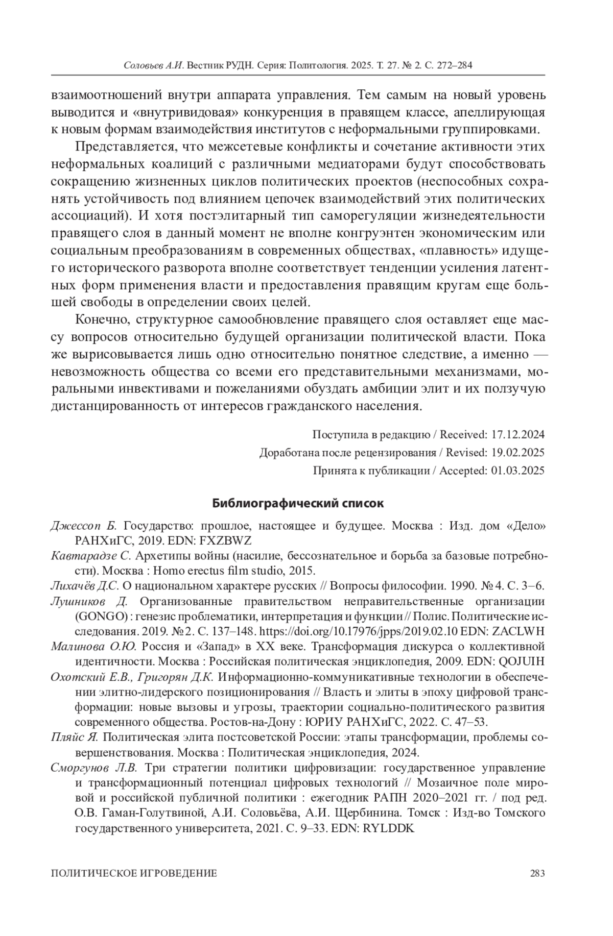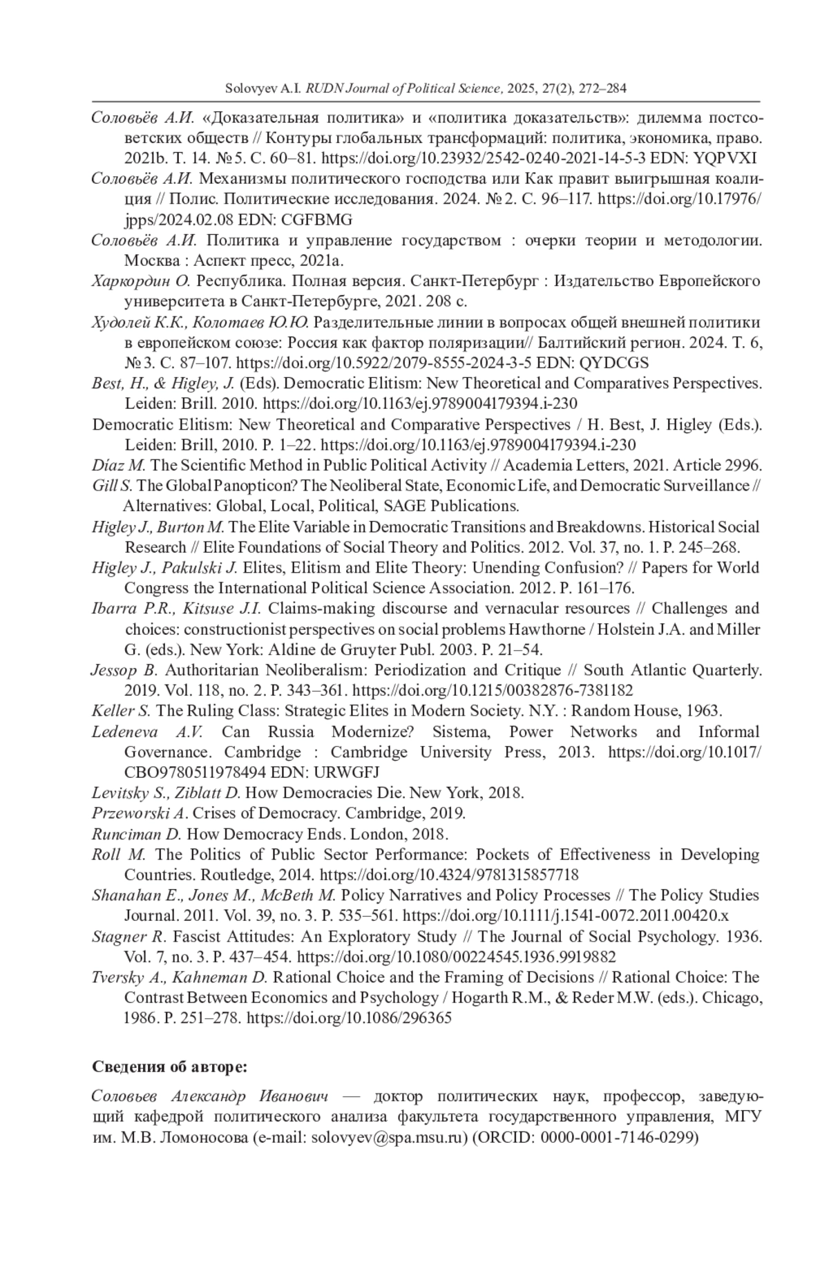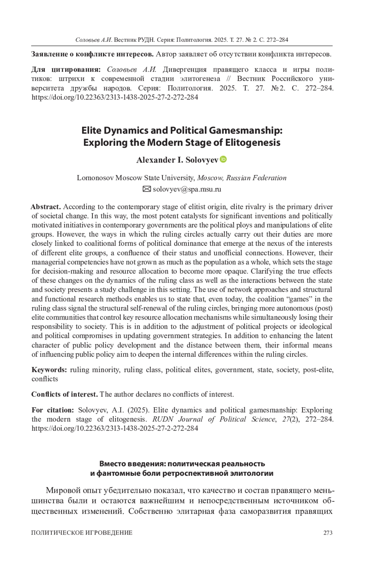 СОЛОВЬЕВ А. И. ДИВЕРГЕНЦИЯ ПРАВЯЩЕГО КЛАССА И ИГРЫ ПОЛИТИКОВ: ШТРИХИ К СОВРЕМЕННОЙ СТАДИИ ЭЛИТОГЕНЕЗА // ВЕСТНИК РОССИЙСКОГО УНИВЕРСИТЕТА ДРУЖБЫ НАРОДОВ. СЕРИЯ: ПОЛИТОЛОГИЯ. 2025. Т. 27 № 2