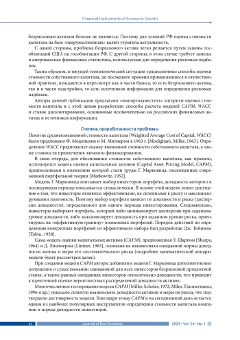Стоимость капитала и определяемая на ее основе ставка дисконтирования являются ключевыми параметрами финансового моделирования и оценки экономической эффективности инвестиционных проектов. Поэтому методика их расчета актуальна для экономистов и финансистов всего мира, а в условиях беспрецедентного санкционного давления она приобрела особую значимость для российских инвесторов, поскольку активы, номинированные в «недружественных» валютах, перестали быть безрисковыми. Исследование направлено на разработку алгоритма оценки стоимости капитала и расчета ставки дисконтирования на базе данных о рублевых безрисковых активах и российской финансовой статистики. Методологическую основу работы составили положения теорий инвестиционного проектирования и корпоративных финансов, а также портфельной теории. Применялись общенаучные (системный анализ и синтез) и эконометрические методы исследования, модели средневзвешенной стоимости капитала (WACC) и оценки капитальных активов (CAPM). Информационной базой послужила статистика российского фондового рынка за 2003–2022 гг. Авторами предложен и апробирован пошаговый алгоритм сбора и обработки российской финансовой статистики для расчета стоимости капитала и рисковых надбавок к ней. Обоснована необходимость вынесения несистематических рисков за пределы средневзвешенной стоимости капитала, а также предложен детерминированный механизм их оценки. Разработанная методика позволяет избежать заградительно высоких значений стоимости капитала, которые возникают в ходе применения иностранных источников информации
