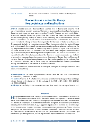 В научном экономическом дискурсе сформировался определенный пул теорий и концепций, которые считаются общепринятыми, имеющими разработанную доказательную базу, этапы формирования, развитые научные школы и пр. Однако, как показывает история экономической мысли, не всегда в своем генезисе данные теории имели однозначную коннотацию и контекстуализацию. Возможно, в настоящее время мы становимся свидетелями формирования новой научной теории – ноономики. Статья посвящена изучению ее сущностных положений и смыслов и обоснованию ее принадлежности к современному этапу развития теорий экономической динамики и стадиальности экономических процессов. Методологической базой исследования послужили указанные теории. Методами работы выступили систематизация и обобщение в части раскрытия ключевых положений теорий экономической цикличности и динамики; логико-структурный и причинно-следственный анализ в части исследования эволюции базиса теорий технологического развития; метод конкретизации в части раскрытия сущностни ноономики. Выделены релевантные характеристики теорий экономической динамики и стадиальности экономических процессов и выполнен анализ ноономики в контексте данных характеристик. Показано, что рассмотренная научная концепция по основным критериям относится к разработкам, обосновывающим переходный этап экономического развития, и является частью указанных теорий. Подтверждена научная основа данной концепции. Результаты исследования вносят вклад в понимание перехода на следующий этап технологического развития экономики и общества в целом, расширяя границы научного познания через призму теорий экономической динамики