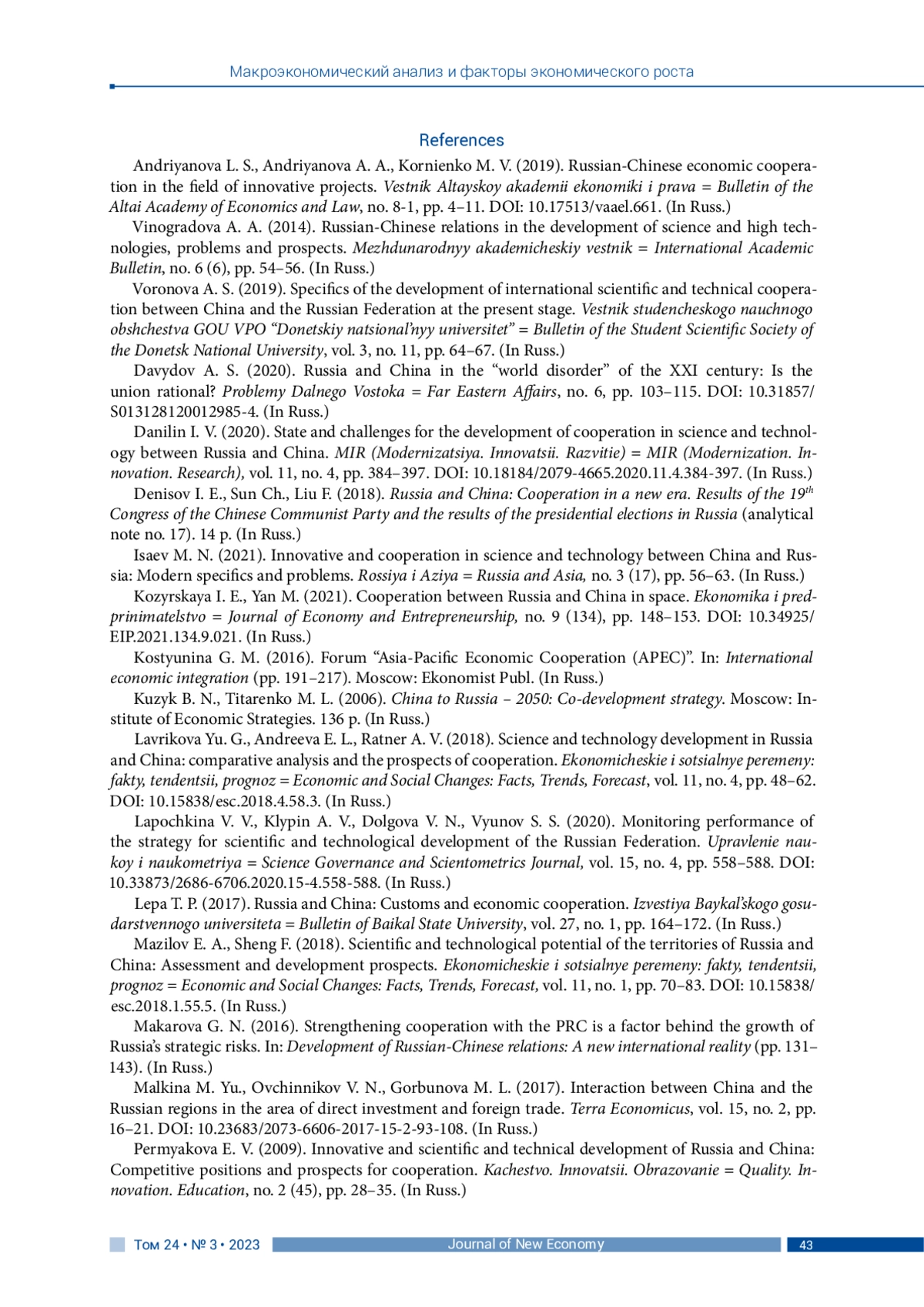 1. Андриянова Л. С., Андриянова А. А., Корниенко М. В. (2019). Российско-китайское экономическое сотрудничество в сфере инновационных проектов // Вестник Алтайской академии экономики и права. № 8-1. С. 4-11. DOI: 10.17513/vaael.661 EDN: BOYXZY