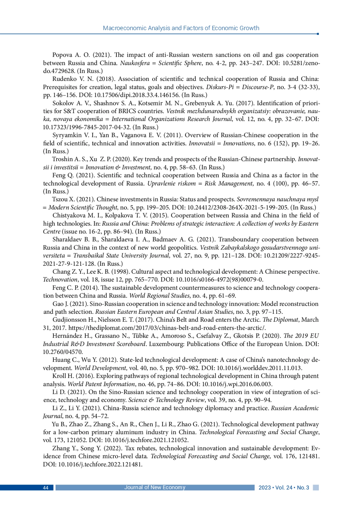 29. Gao J. (2021). Sino-Russian cooperation in science and technology innovation: Model reconstruction and path selection. Russian Eastern European and Central Asian Studies, no. 3, pp. 97-115.