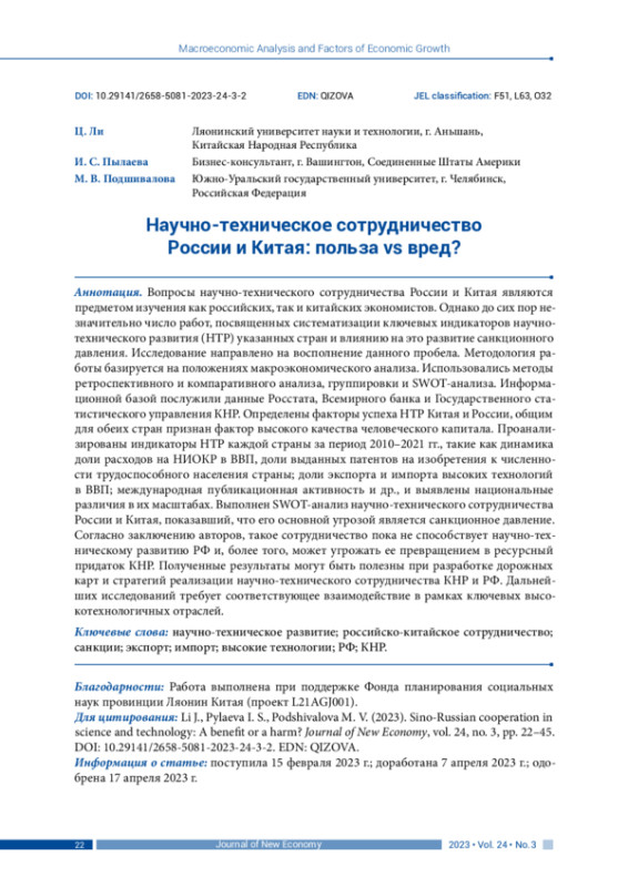 Вопросы научно-технического сотрудничества России и Китая являются предметом изучения как российских, так и китайских экономистов. Однако до сих пор незначительно число работ, посвященных систематизации ключевых индикаторов научнотехнического развития (НТР) указанных стран и влиянию на это развитие санкционного давления. Исследование направлено на восполнение данного пробела. Методология работы базируется на положениях макроэкономического анализа. Использовались методы ретроспективного и компаративного анализа, группировки и SWOT-анализа. Информационной базой послужили данные Росстата, Всемирного банка и Государственного статистического управления КНР. Определены факторы успеха НТР Китая и России, общим для обеих стран признан фактор высокого качества человеческого капитала. Проанализированы индикаторы НТР каждой страны за период 2010–2021 гг., такие как динамика доли расходов на НИОКР в ВВП, доли выданных патентов на изобретения к численности трудоспособного населения страны; доли экспорта и импорта высоких технологий в ВВП; международная публикационная активность и др., и выявлены национальные различия в их масштабах. Выполнен SWOT-анализ научно-технического сотрудничества России и Китая, показавший, что его основной угрозой является санкционное давление. Согласно заключению авторов, такое сотрудничество пока не способствует научно-техническому развитию РФ и, более того, может угрожать ее превращением в ресурсный придаток КНР. Полученные результаты могут быть полезны при разработке дорожных карт и стратегий реализации научно-технического сотрудничества КНР и РФ. Дальнейших исследований требует соответствующее взаимодействие в рамках ключевых высокотехнологичных отраслей