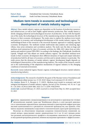 Регионы металлургического профиля в силу зависимости от локализации производственных ресурсов и инфраструктуры, а также высокой капиталоемкости производства характеризуются медленно меняющейся отраслевой и технологической структурой производства. Согласно гипотезе исследования, отличия в динамике их экономического развития определяются указанной структурой производства обрабатывающей промышленности. Статья посвящена исследованию среднесрочных трендов и закономерностей экономического и технологического развития регионов металлургического профиля. Методологической основой работы послужили положения структурно-динамического подхода к изучению экономического развития регионов. Методы исследования включали многомерный анализ данных и алгоритмы кластеризации, оценку временных рядов и корреляционный анализ. Информационной базой послужили данные о крупных и средних региональных предприятиях в разрезе видов экономической деятельности за 2006–2021 гг., содержащиеся в Информационно-аналитической системе FIRA PRO. Выявлены регионы с металлургическим профилем экономики: Челябинская, Свердловская, Липецкая, Вологодская и Тульская области. Определение среднесрочных трендов их экономического развития позволяет говорить о различной динамике результирующих и ресурсных показателей производства как по всем видам деятельности, так и в части металлургии. Обосновано, что динамические характеристики развития регионов со специализацией экономики на металлургии в значительной мере зависят от технологического профиля обрабатывающего производства. Результаты исследования вносят вклад в понимание механизмов адаптации промышленных комплексов регионов к меняющимся условиям внешней среды.