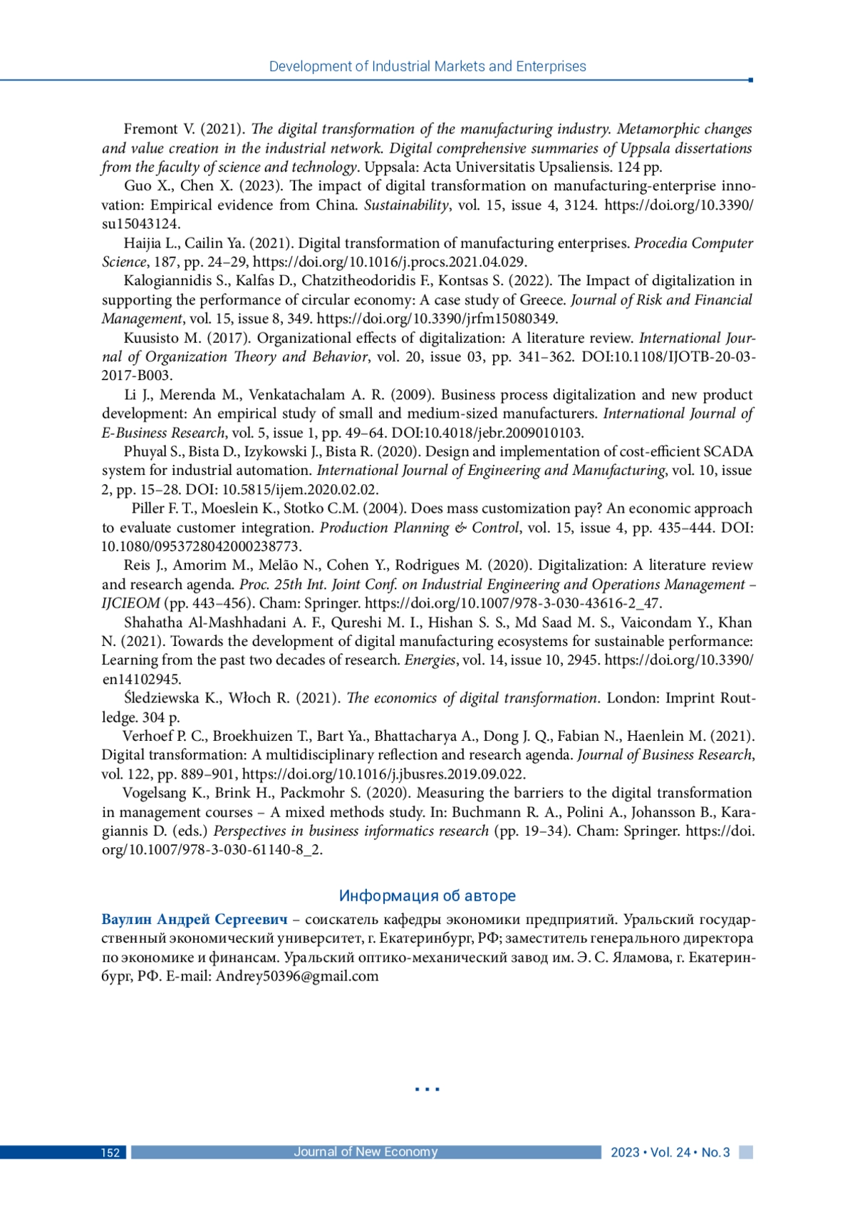 19. Fremont V. (2021). The digital transformation of the manufacturing industry. Metamorphic changes and value creation in the industrial network. Digital comprehensive summaries of Uppsala dissertations from the faculty of science and technology. Uppsala: Acta Universitatis Upsaliensis. 124 pp.
