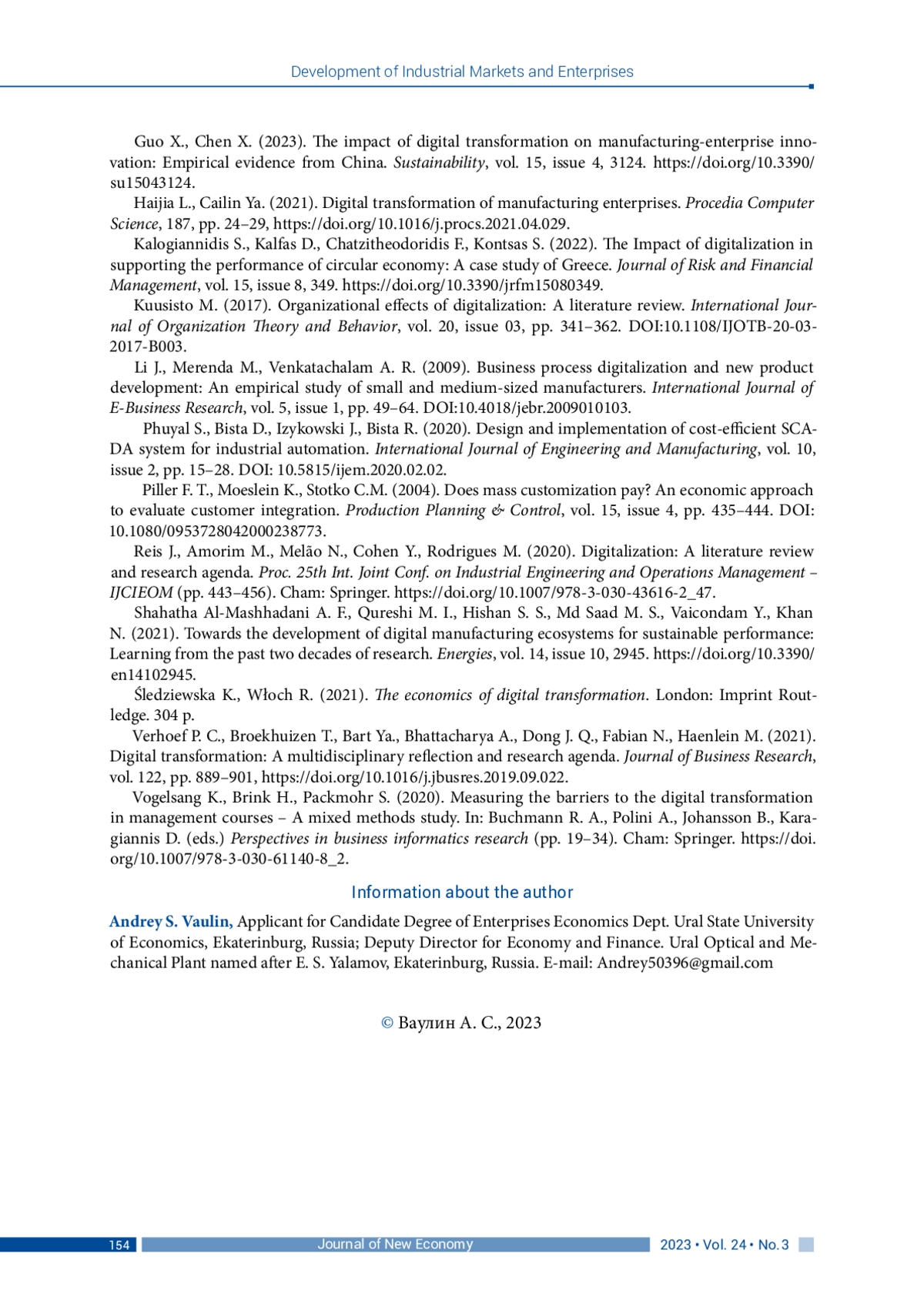 20. Guo X., Chen X. (2023). The impact of digital transformation on manufacturing-enterprise innovation: Empirical evidence from China. Sustainability, vol. 15, issue 4, 3124. DOI: 10.3390/su15043124 EDN: FPLZKQ