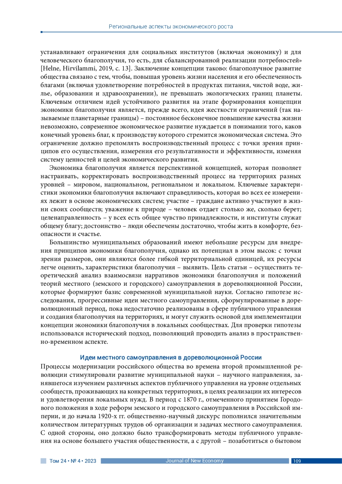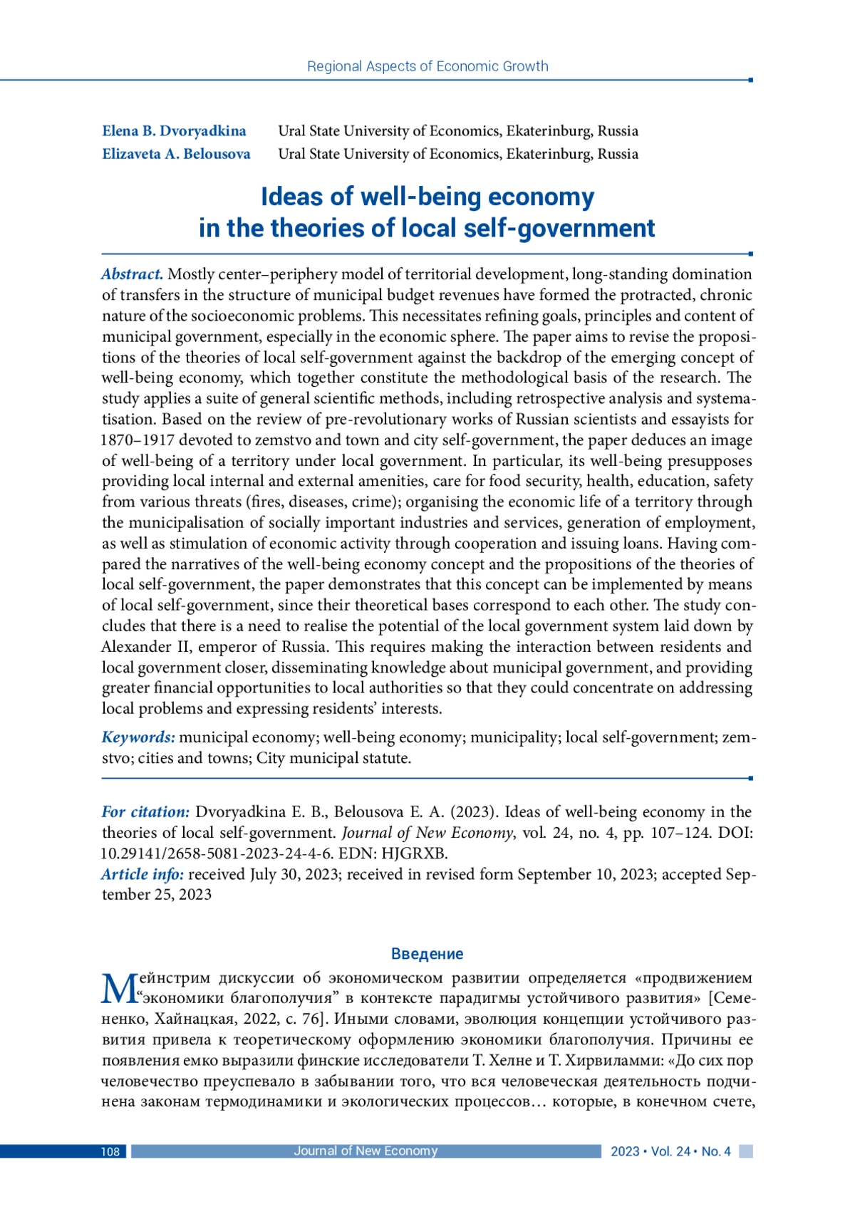 Преимущественно центр-периферийная модель развития территорий, длительное доминирование трансфертов в структуре доходов муниципальных бюджетов сформировали затяжной, хронический характер социально-экономических проблем. Это обуславливает необходимость пересмотра целей, принципов и содержания муниципального управления, особенно в сфере экономики. Статья направлена на ревизию положений теорий местного самоуправления в контексте развивающейся концепции экономики благополучия, которые составили методологическую базу работы. Использовался комплекс общенаучных методов, включая ретроспективный анализ и систематизацию. Проведен обзор дореволюционных работ российских ученых и публицистов за период 1870–1917 гг., посвященных земскому и городскому самоуправлению. Выявлен образ благополучия территории местного самоуправления, заключающийся в обеспечении наружного и внутреннего благоустройства территории; попечении о продовольственной обеспеченности, здоровье, образовании, безопасности от различных угроз (пожаров, болезней, преступности); организации экономической жизни территории через муниципализацию общественно значимых производств и услуг, трудоустройство безработных, а также стимулирование экономической деятельности посредством кооперации и выдачи кредитов. На основе сопоставления нарративов концепции экономики благополучия и положений теорий местного самоуправления показано, что эта концепция может быть реализована средствами местного самоуправления, так как их теоретическая база соответствует друг другу. Сделан вывод о необходимости реализации потенциала системы местного самоуправления, заложенного Александром II. Для этого требуется увеличить тесноту взаимодействия жителей и органов управления, распространить знания о муниципальном управлении, предоставить большие финансовые возможности местным властям для концентрации на решении локальных проблем и выражении интересов местного населения