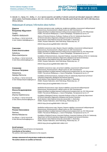 3. Нилова Л.П., Потороко И.Ю. Каротиноиды в растительных пищевых системах // Вестник Южно-Уральского государственного университета. Серия: Пищевые и биотехнологии. 2021. Т. 9, № 4. С. 54-69. 10.14529/food210407. DOI: 10.14529/food210407.EDN EDN: WGNNUH