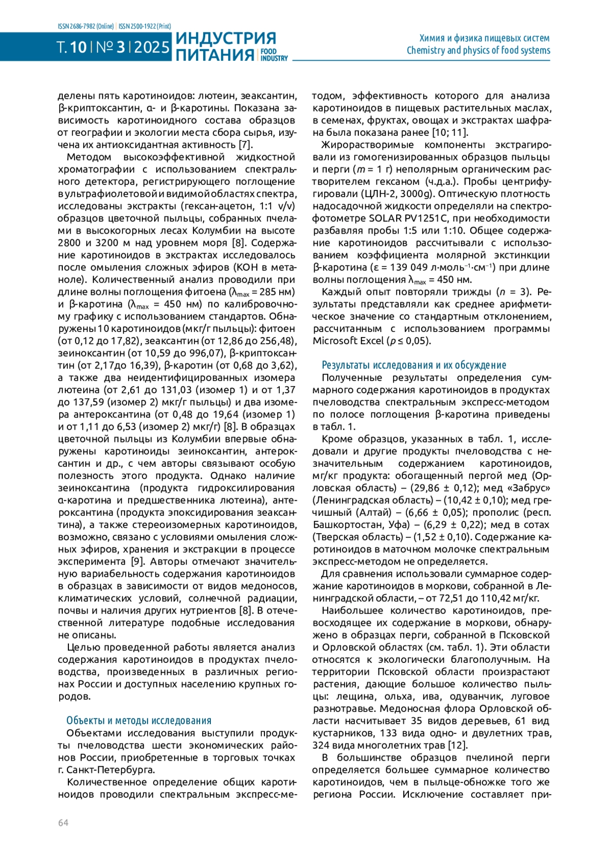 Включение собранной пчелами цветочной пыльцы-обножки и перги (ферментированной пыльцы) в функциональные продукты питания обогащает их белками, незаменимыми аминокислотами, углеводами, витаминами, микро- и макроэлементами, фитонутриентами, из которых наименее изучены каротиноиды. Их содержание зависит от географии и экологии места сбора и условий хранения продуктов, но сравнительный анализ концентрации каротиноидов в продуктах пчеловодства различных регионов нашей страны отсутствует в научной литературе. Цель работы – определение содержания каротиноидов в продуктах пчеловодства шести экономических районов России: Центрального, Северо-Западного, Западно-Сибирского, Северо-Кавказского, Уральского и Поволжского. Объекты исследования – образцы пчелиной перги, цветочной пыльцы-обножки, обогащенного пергой меда, прополиса, маточного молочка. Определение суммы каротиноидов в экстрактах проводили методом спектрального экспресс-анализа по полосе поглощения β-каротина (λmax = 450 нм, ε = 139049 л·моль −1 ·см−1 ). В семи из 15 исследованных образцов перги и пыльцы, приобретенных в Санкт-Петербурге, суммарное содержание каротиноидов превышает их содержание в моркови – традиционном пищевом источнике этих нутриентов. Наибольшее содержание обнаружено в образцах, собранных в экологически благополучных областях – Псковской (Северо-Западный экономический район) и Орловской (Центральный экономический район). В образцах меда и прополиса суммарное содержание каротиноидов незначительно. В маточном молочке спектральным методом каротиноиды не определены. Содержание каротиноидов зависит от длительности и условий хранения продукта. Показано, что термостатирование пчелиной перги при температуре 37–38 °C в течение 3; 6; 9 и 12 ч повышает концентрацию свободных ксантофилов в результате ферментации. В тех же условиях суммарное содержание каротиноидов в пыльце-обножке снижается. Хранение продуктов пчеловодства в течение года при комнатной температуре (25 °C) снижает суммарную концентрацию каротиноидов. Показано, что пчелиная перга и пыльца-обножка шести экономических районов России являются ценными источниками каротиноидов.