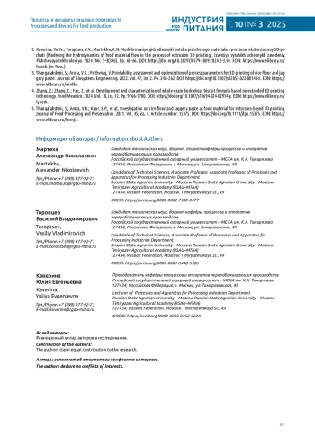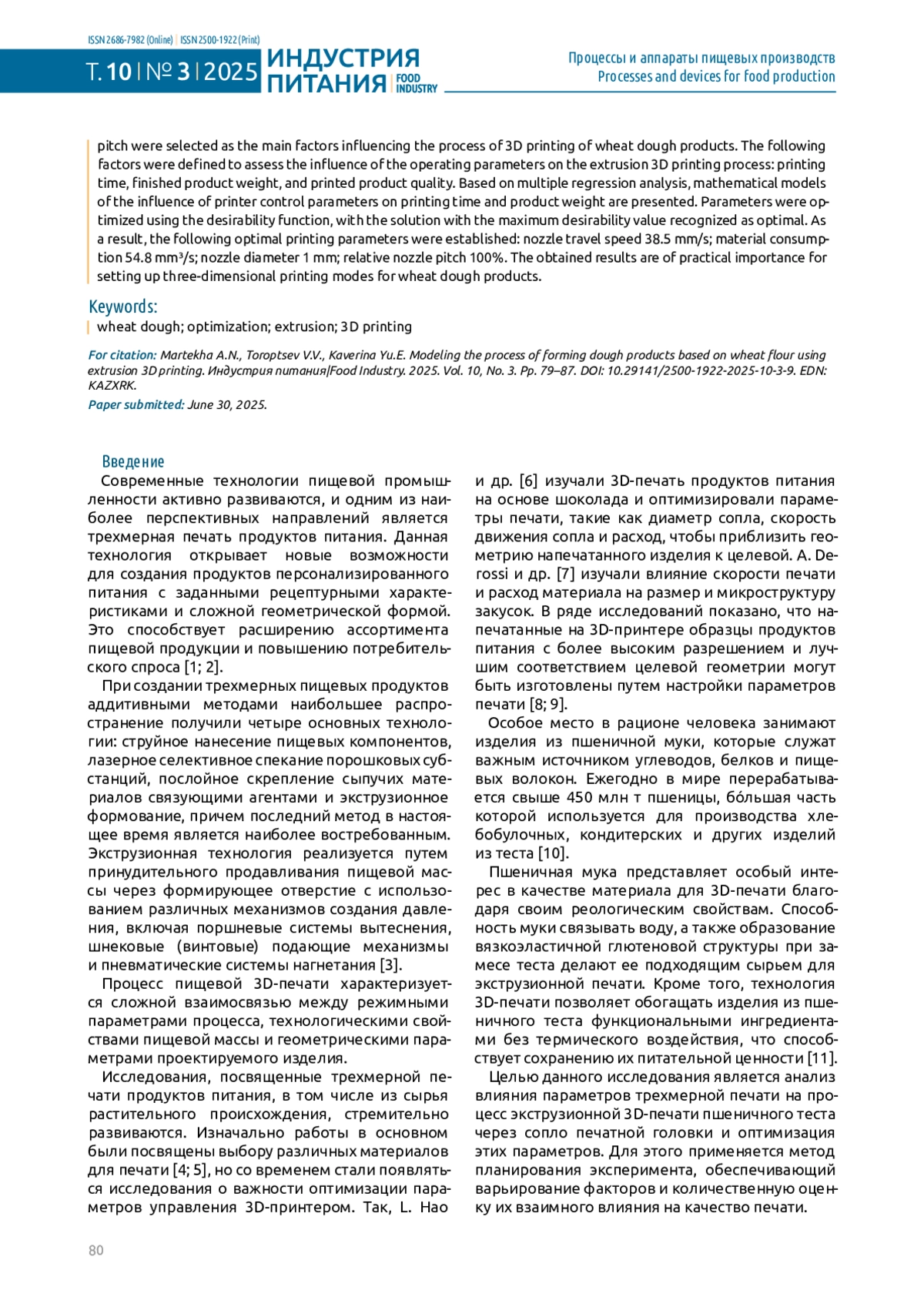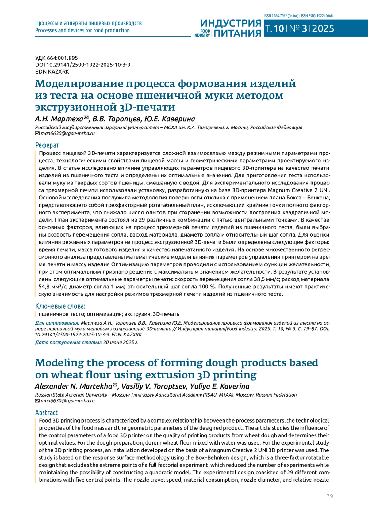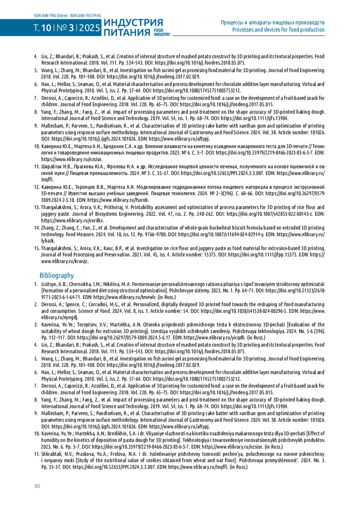 3. Каверина Ю.Е., Торопцев В.В., Мартеха А.Н. Оценка пригодности пшеничного теста к экструзионной 3D-печати // Известия высших учебных заведений. Пищевая технология. 2024. № 5-6(396). С. 112-117. 10.26297/0579-3009.2024.5-6.17. DOI: 10.26297/0579-3009.2024.5-6.17.EDN EDN: YICQDH