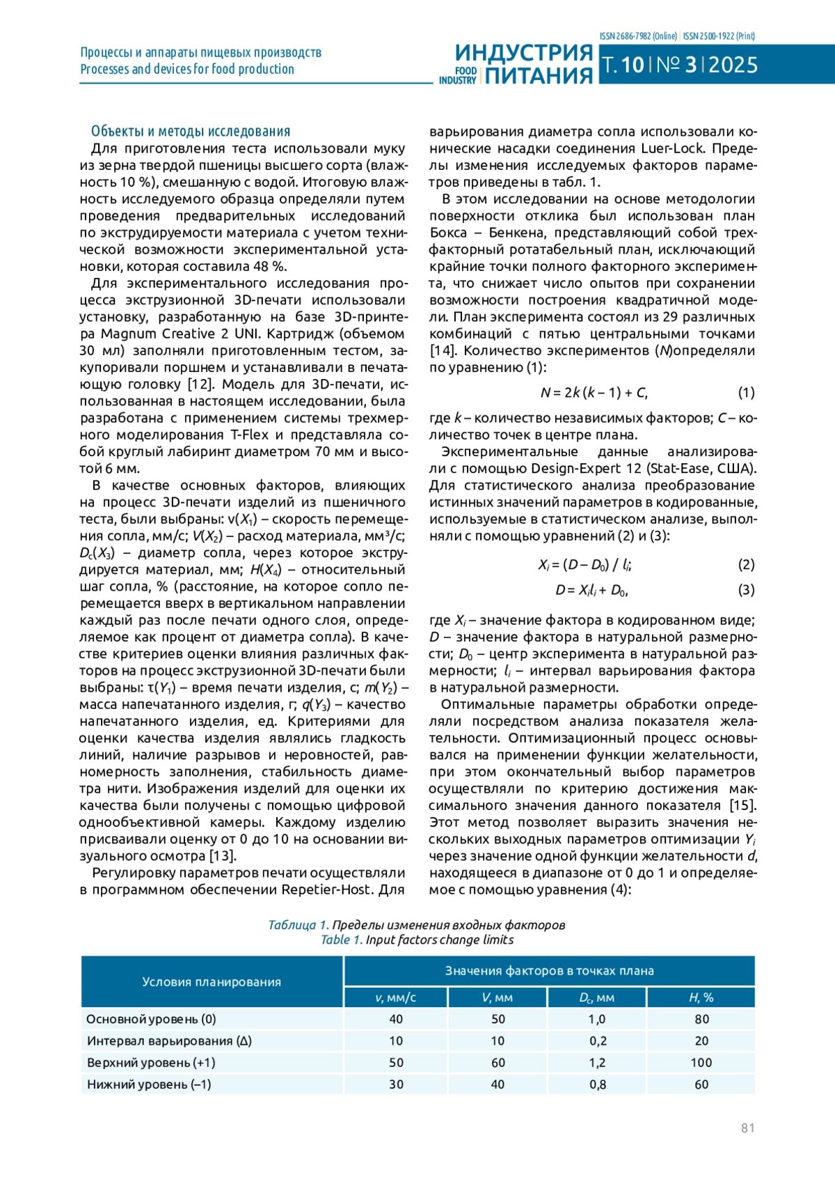 Процесс пищевой 3D-печати характеризуется сложной взаимосвязью между режимными параметрами процесса, технологическими свойствами пищевой массы и геометрическими параметрами проектируемого изделия. В статье исследовано влияние управляющих параметров пищевого 3D-принтера на качество печати изделий из пшеничного теста и определены их оптимальные значения. Для приготовления теста использовали муку из твердых сортов пшеницы, смешанную с водой. Для экспериментального исследования процесса трехмерной печати использовали установку, разработанную на базе 3D-принтера Magnum Creative 2 UNI. Основой исследования послужила методология поверхности отклика с применением плана Бокса – Бенкена, представляющего собой трехфакторный ротатабельный план, исключающий крайние точки полного факторного эксперимента, что снижало число опытов при сохранении возможности построения квадратичной модели. План эксперимента состоял из 29 различных комбинаций с пятью центральными точками. В качестве основных факторов, влияющих на процесс трехмерной печати изделий из пшеничного теста, были выбраны скорость перемещения сопла, расход материала, диаметр сопла и относительный шаг сопла. Для оценки влияния режимных параметров на процесс экструзионной 3D-печати были определены следующие факторы: время печати, масса готового изделия и качество напечатанного изделия. На основе множественного регрессионного анализа представлены математические модели влияния параметров управления принтером на время печати и массу изделия Оптимизацию параметров проводили с использованием функции желательности, при этом оптимальным признано решение с максимальным значением желательности. В результате установлены следующие оптимальные параметры печати: скорость перемещения сопла 38,5 мм/с; расход материала 54,8 мм³/с; диаметр сопла 1 мм; относительный шаг сопла 100 %. Полученные результаты имеют практическую значимость для настройки режимов трехмерной печати изделий из пшеничного теста