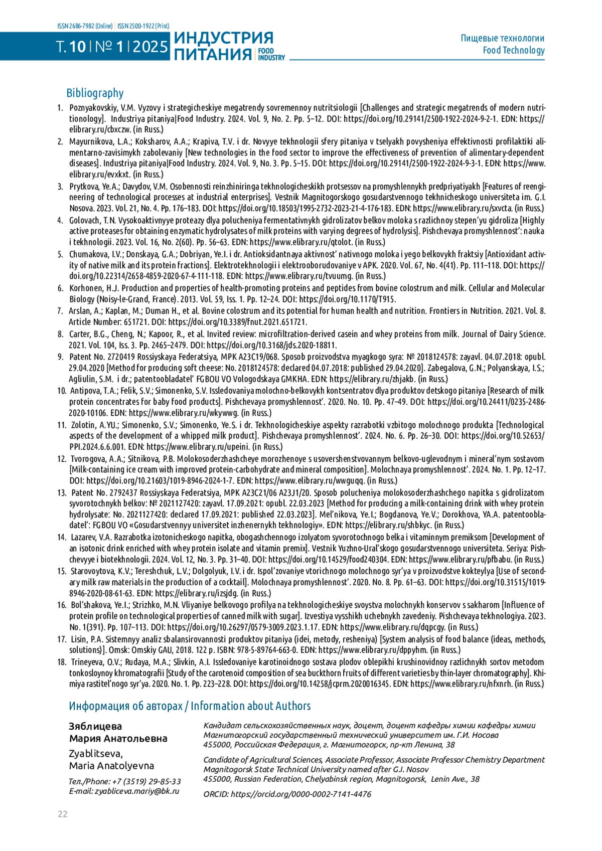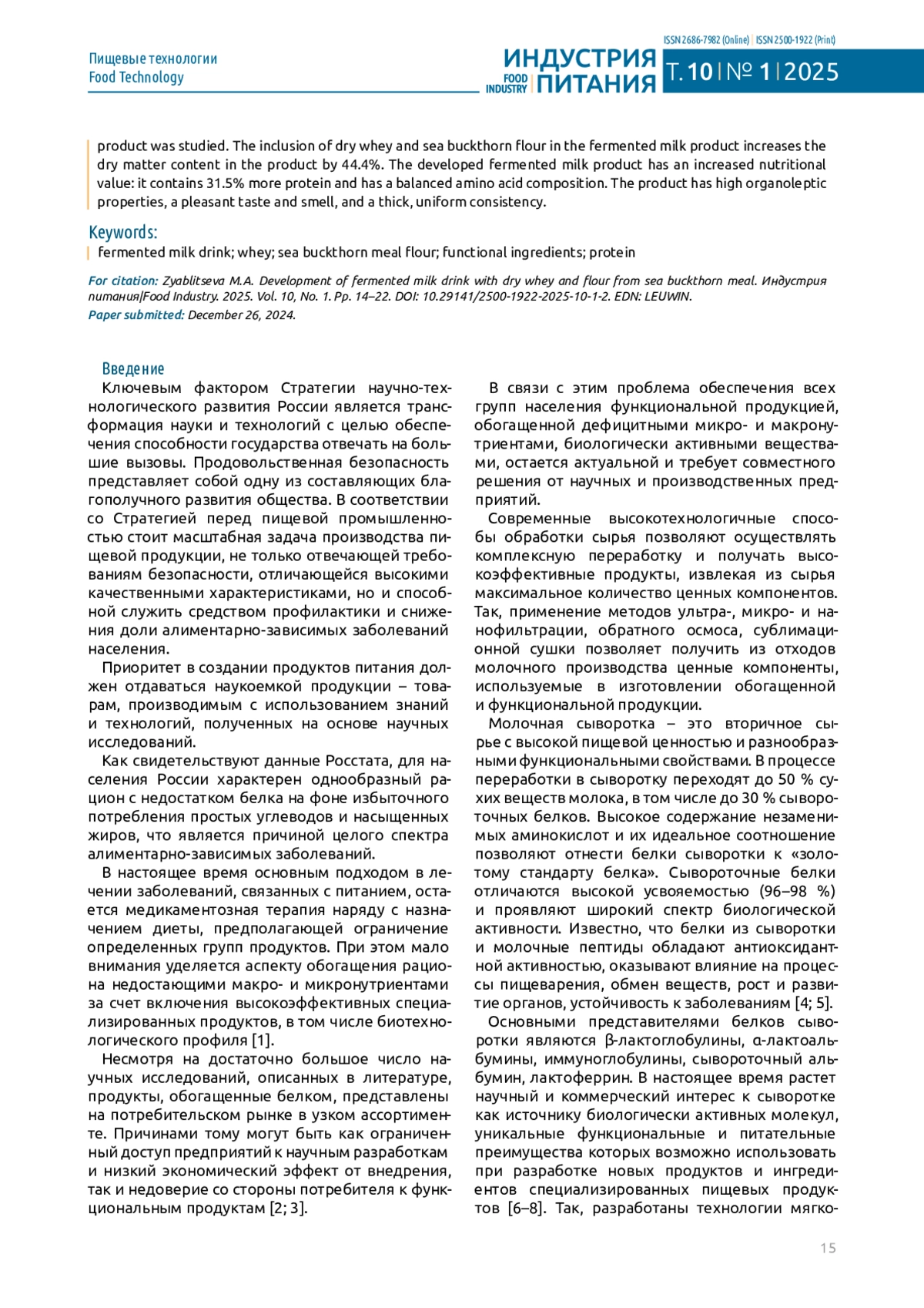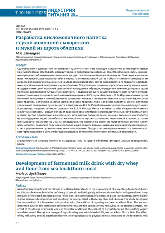 ЗЯБЛИЦЕВА М. А. РАЗРАБОТКА КИСЛОМОЛОЧНОГО НАПИТКА С СУХОЙ МОЛОЧНОЙ СЫВОРОТКОЙ И МУКОЙ ИЗ ШРОТА ОБЛЕПИХИ // ИНДУСТРИЯ ПИТАНИЯ. 2025. Т. 10 № 1