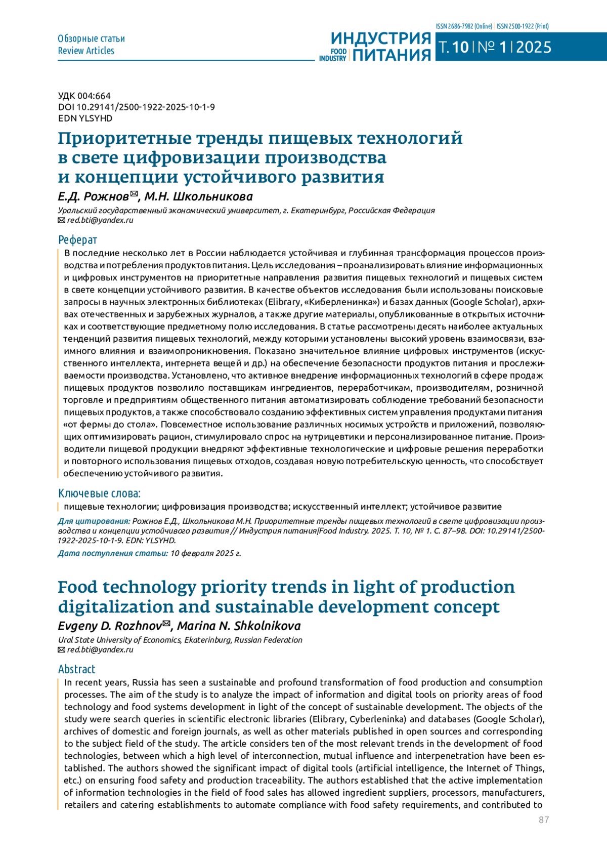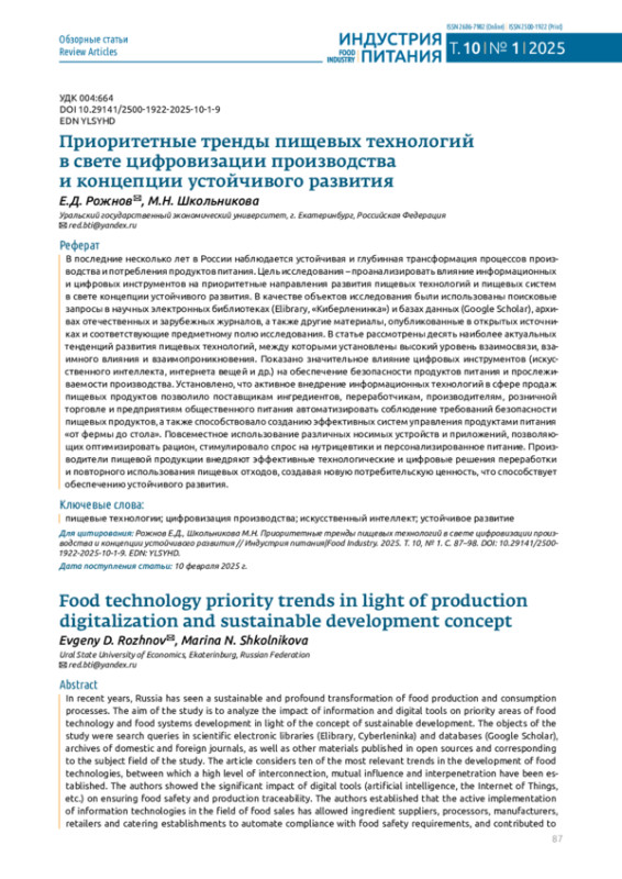 В последние несколько лет в России наблюдается устойчивая и глубинная трансформация процессов производства и потребления продуктов питания. Цель исследования – проанализировать влияние информационных и цифровых инструментов на приоритетные направления развития пищевых технологий и пищевых систем в свете концепции устойчивого развития. В качестве объектов исследования были использованы поисковые запросы в научных электронных библиотеках (Elibrary, «Киберленинка») и базах данных (Google Scholar), архивах отечественных и зарубежных журналов, а также другие материалы, опубликованные в открытых источниках и соответствующие предметному полю исследования. В статье рассмотрены десять наиболее актуальных тенденций развития пищевых технологий, между которыми установлены высокий уровень взаимосвязи, взаимного влияния и взаимопроникновения. Показано значительное влияние цифровых инструментов (искусственного интеллекта, интернета вещей и др.) на обеспечение безопасности продуктов питания и прослеживаемости производства. Установлено, что активное внедрение информационных технологий в сфере продаж пищевых продуктов позволило поставщикам ингредиентов, переработчикам, производителям, розничной торговле и предприятиям общественного питания автоматизировать соблюдение требований безопасности пищевых продуктов, а также способствовало созданию эффективных систем управления продуктами питания «от фермы до стола». Повсеместное использование различных носимых устройств и приложений, позволяющих оптимизировать рацион, стимулировало спрос на нутрицевтики и персонализированное питание. Производители пищевой продукции внедряют эффективные технологические и цифровые решения переработки и повторного использования пищевых отходов, создавая новую потребительскую ценность, что способствует обеспечению устойчивого развития