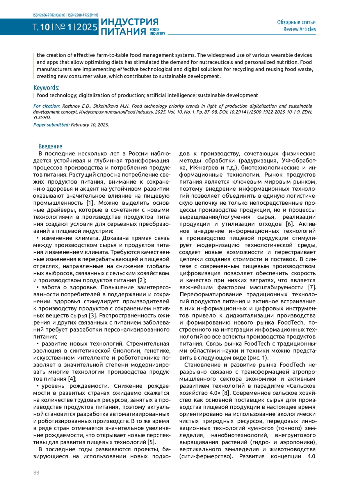 В последние несколько лет в России наблюдается устойчивая и глубинная трансформация процессов производства и потребления продуктов питания. Растущий спрос на потребление свежих продуктов питания, внимание к сохранению здоровья и акцент на устойчивом развитии оказывают значительное влияние на пищевую промышленность [1]. Можно выделить основные драйверы, которые в сочетании с новыми технологиями в производстве продуктов питания создают условия для серьезных преобразований в пищевой индустрии