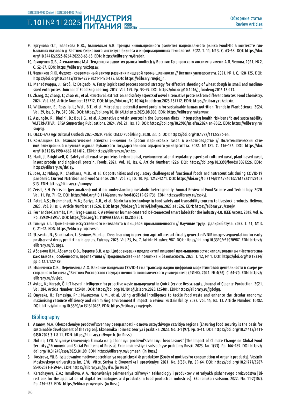 26. Абрамов В.И., Абрамов О.В., Гордеев В.В. и др. Цифровизация предприятий пищевой промышленности с использованием “Честного знака”: вызовы, особенности, перспективы // Продовольственная политика и безопасность. 2025. Т. 12, № 1. DOI: 10.18334/ppib.12.1.122489 EDN: HFRNWP