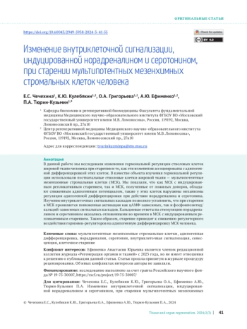 В данной работе мы исследовали изменения гормональной регуляции стволовых клеток жировой ткани человека при старении и то, как эти изменения ассоциированы с адипогенной дифференцировкой этих клеток. В качестве объекта изучения гормональной регуляции использовали постнатальные стволовые клетки жировой ткани — мультипотентные мезенхимные стромальные клетки (МСК). Мы показали, что как МСК с индуцированным репликативным старением, так и МСК, полученные от пожилых доноров, обладают сниженным адипогенным потенциалом, также у этих клеток нарушены механизмы регуляции адипогенной дифференцировки при действии норадреналина и серотонина. Изучение внутриклеточных сигнальных каскадов позволило установить, что при старении в МСК проявляется пониженная активация как цАМФ-зависимых, так и фосфоинозитид/ кальций-зависимых сигнальных каскадов. Кальциевые ответы на стимуляцию норадреналином и серотонином оказались отложенными во времени в МСК с индуцированным репликативным старением. Таким образом, старение приводит к снижению регуляторного воздействия гормонов-регуляторов на адипогенную дифференцировку МСК человека.