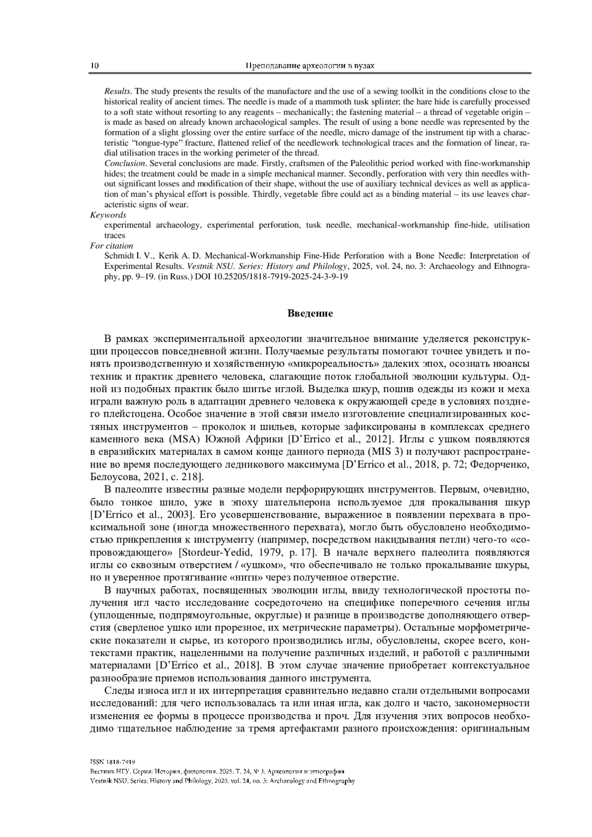 11. Шмидт И. В., Ковальченко Е. А. Результаты эксперимента по использованию костяной иглы для перфорации шкуры грубой выделки // Вестник НГУ. Серия: История, филология. 2022. Т. 21, № 5. С. 20-31.