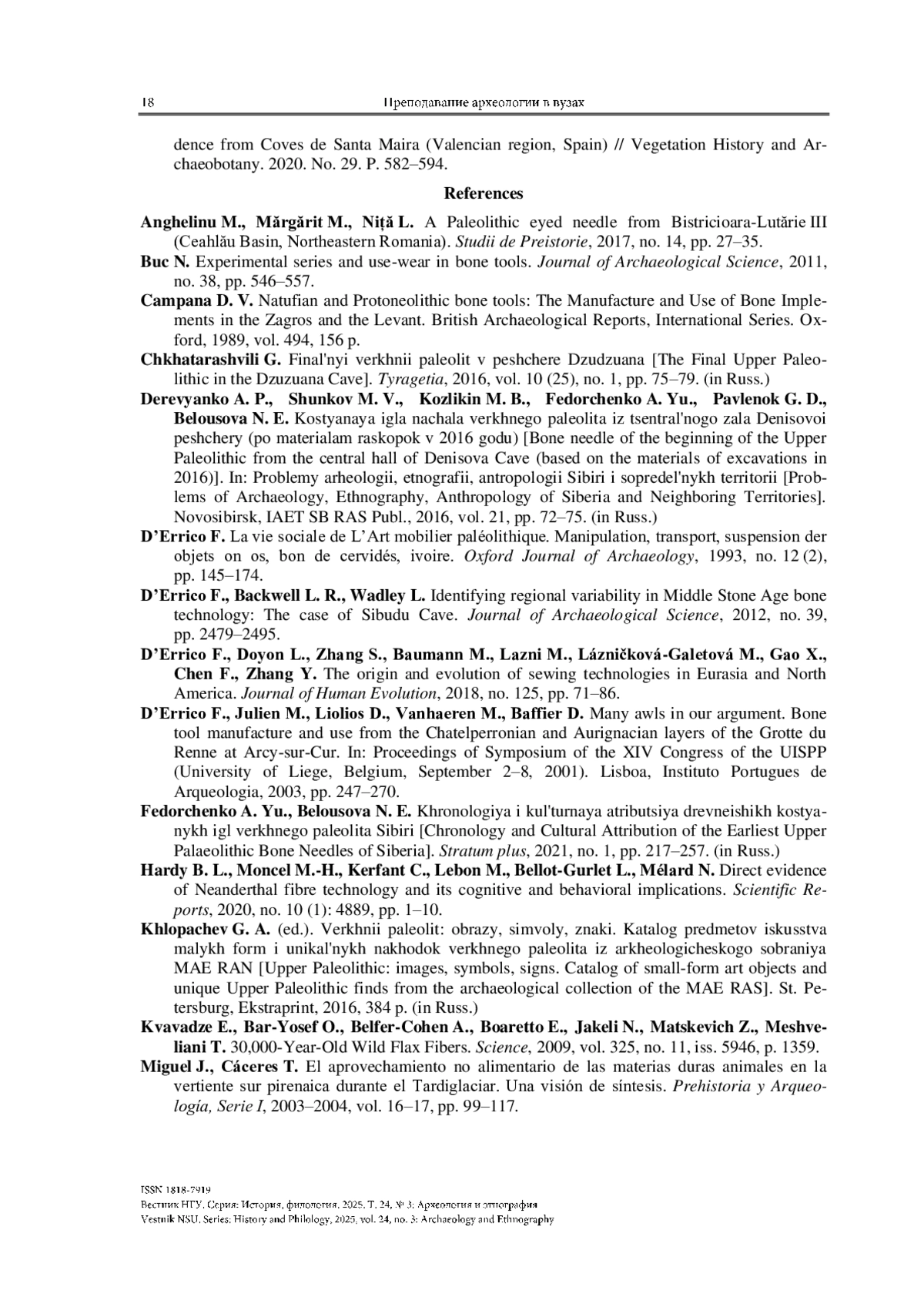 17. D’Errico F., Doyon L., Zhang S., Baumann M., Lazni M., Lázničková-Galetová M., Gao X., Chen F., Zhang Y. The origin and evolution of sewing technologies in Eurasia and North America // Journal of Human Evolution. 2018. No. 125. P. 71-86.