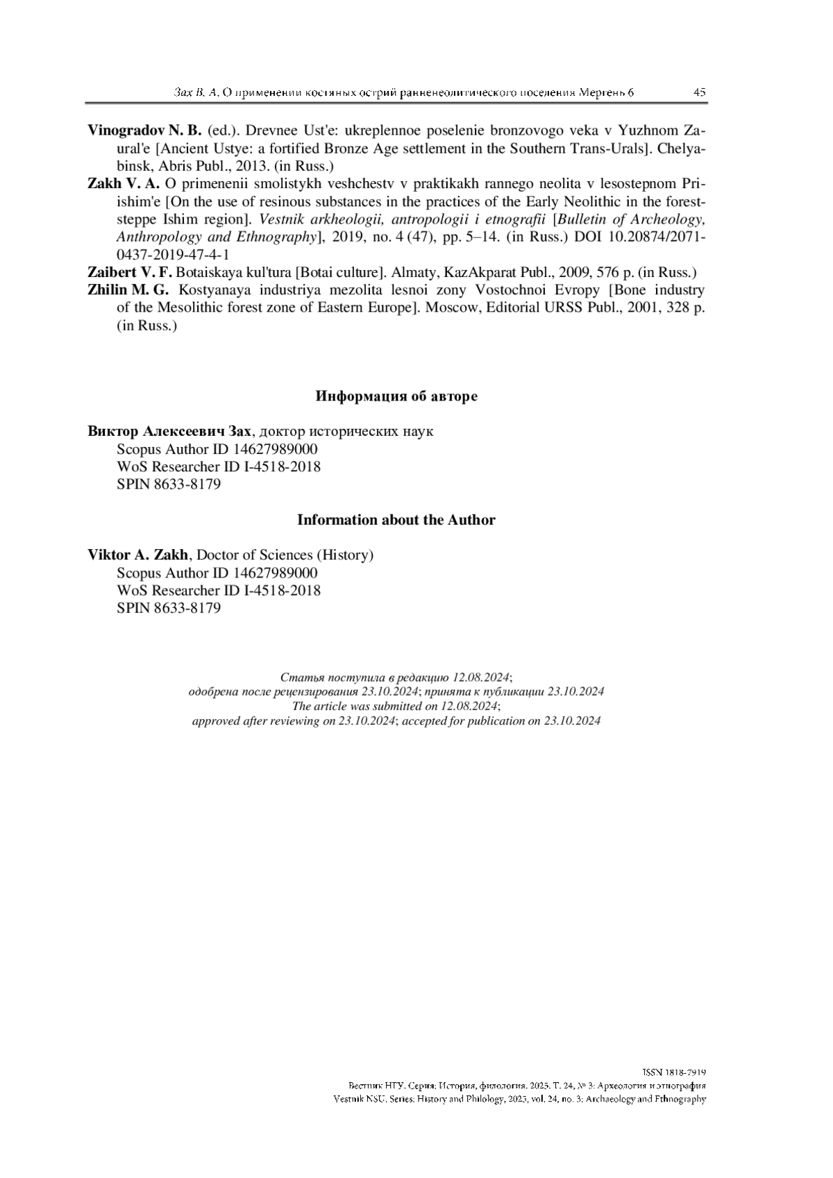 6. Зах В. А. О применении смолистых веществ в практиках раннего неолита в лесостепном Приишимье // Вестник археологии, антропологии и этнографии. 2019. № 4. С. 5-14. https://doi.org/10.20874/2071-0437-2019-47-4-1