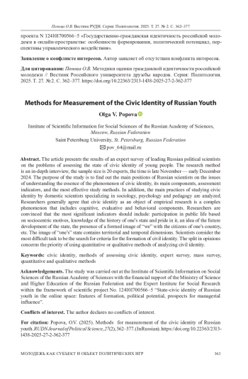 В современной научной литературе в изучении формирования идентичности молодежи в онлайн-пространстве основное внимание исследователей привлекает проблематика виртуальной идентичности. Однако автором фокус внимания переносится на проблематику конструирования в онлайн-пространстве реальной идентичности. Методологической основой исследования является конструктивизм. Эмпирической основу исследования составили результаты экспертного онлайн-опроса, проведенного в форме нестандартизованного интервью в ноябре 2024 г. Для обработки результатов опроса применен метод дискурс-анализа. Целесообразность активной работы государства по конструированию идентичности молодежи с применением ресурсов Интернета не ставится экспертами под сомнение. Раскрыта специфика отдельных видов интернет-ресурсов, которые эксперты признают в качестве наиболее влиятельных на процесс формирования идентичностей молодых российских пользователей. Определены возможности развлекательных и игровых ресурсов в процессе формирования государственно-гражданской идентичности молодежи. Эксперты обращают внимание на недопустимость формального подхода при проведении политики конструирования идентичности в Интернете. Эффективное использование государством ресурсов Интернета для влияния на формирование идентичности молодежи возможно только при условии применения государством достаточно тонких методов работы. Результаты обработки экспертного опроса подтверждают сохранение методологического конфликта между теориями подкрепления и мобилизации в вопросах интерпретации влияния современных информационных технологий на политическое сознание и формирование идентичности граждан.