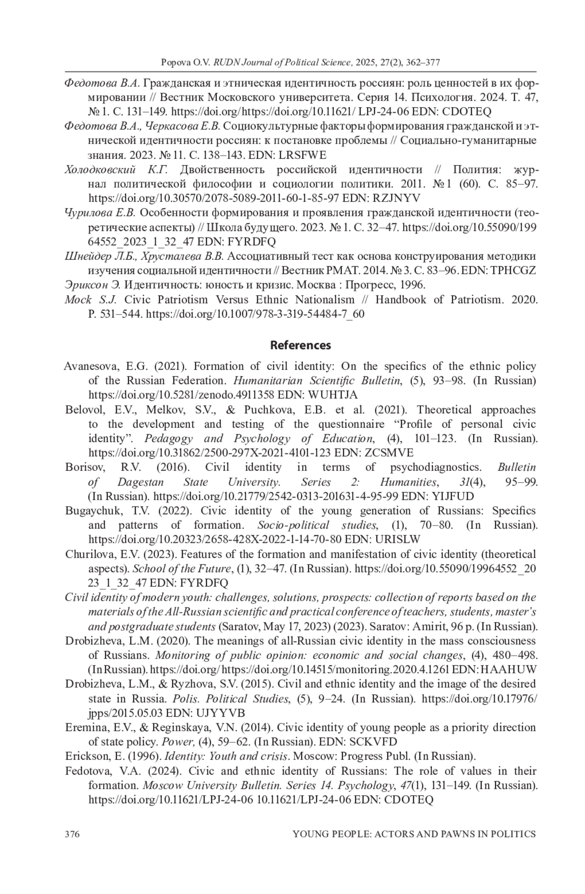 19. Федотова В.А. Гражданская и этническая идентичность россиян: роль ценностей в их формировании // Вестник Московского университета. Серия 14. Психология. 2024. Т. 47, № 1. С. 131-149. 10.11621/ LPJ-24-06. DOI: 10.11621/LPJ-24-06 EDN: CDOTEQ