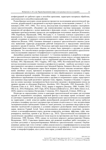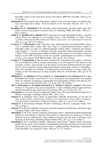 13. Левина Е. В., Федорченко А. Ю. Сравнение особенностей формообразования макро- и микроследов на поверхности орудий из разного минерального сырья // Новые материалы и методы археологического исследования: история vs источниковедение: Материалы VII Конференции молодых ученых. М.: ИА РАН, 2023. С. 26-28.