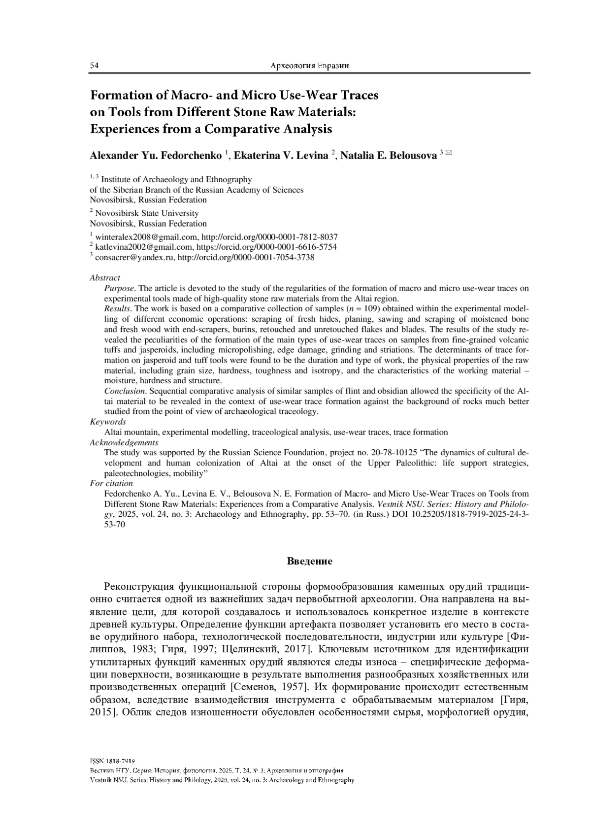 Статья посвящена исследованию закономерностей формообразования макро- и микроследов износа на экспериментальных орудиях, изготовленных из высококачественного каменного сырья Алтайского региона. Основой работы послужила сравнительная коллекция трасологических эталонов (n = 109), полученная в рамках программы экспериментального моделирования различных хозяйственных операций: скобления свежих шкур, строгания, пиления и скобления увлажненной кости и дерева с использованием концевых скребков, резцов, ретушированных и неретушированных сколов. Результаты исследования выявили специфику формирования ключевых типов следов износа на эталонных орудиях из тонкозернистых вулканических туфов и яшмоидов, включая заполировки, выкрошенность, пришлифовку и линейные следы. Было установлено, что определяющими факторами следообразования на орудиях из яшмоидов и туфов являлись продолжительность и характер работы, физические свойства сырья, включая зернистость, твердость, вязкость и изотропность, а также особенности материала обработки – влажность, твердость и структура. Последовательный сравнительный анализ аналогичных эталонов из кремня и обсидиана позволил выявить специфику алтайского материала в контексте следообразования на фоне пород, гораздо более изученных с точки зрения археологической трасологии.