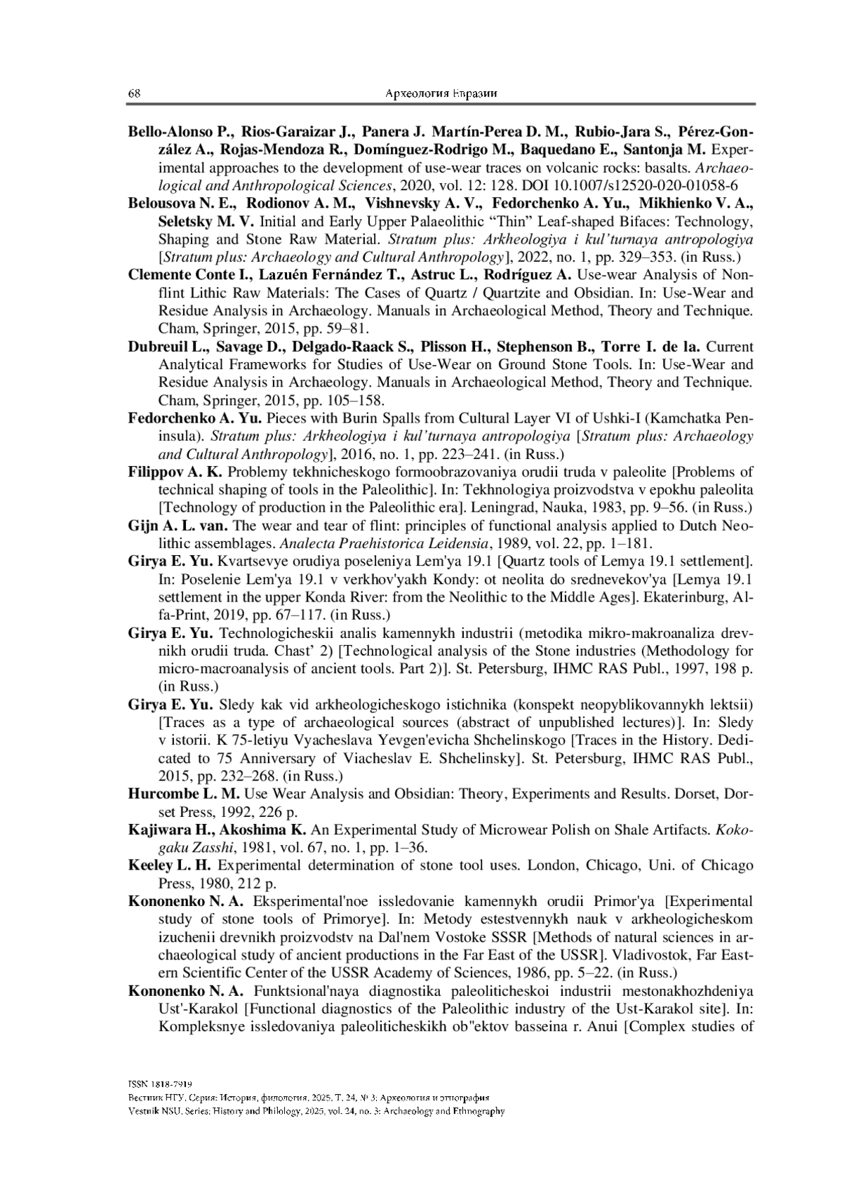30. Kononenko N. Experimental and archaeological studies of use-wear and residues on obsidian artefacts from Papua New Guinea // Technical Reports of the Australian Museum. 2011. Vol. 21. P. 1-244.